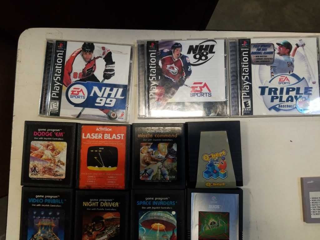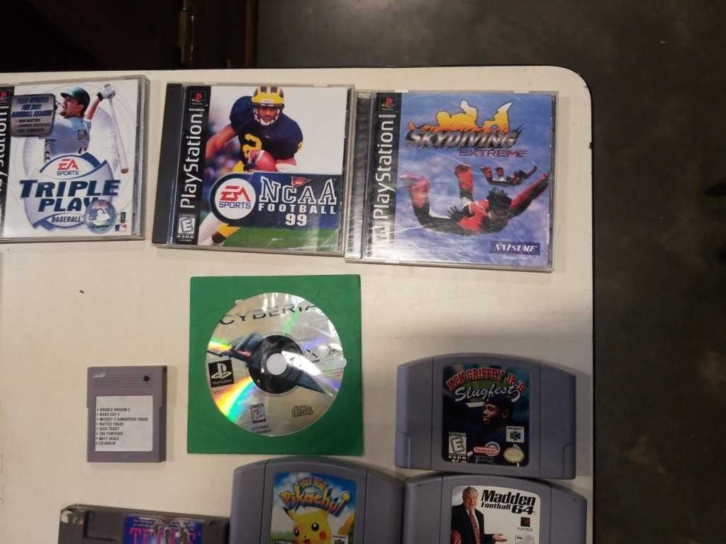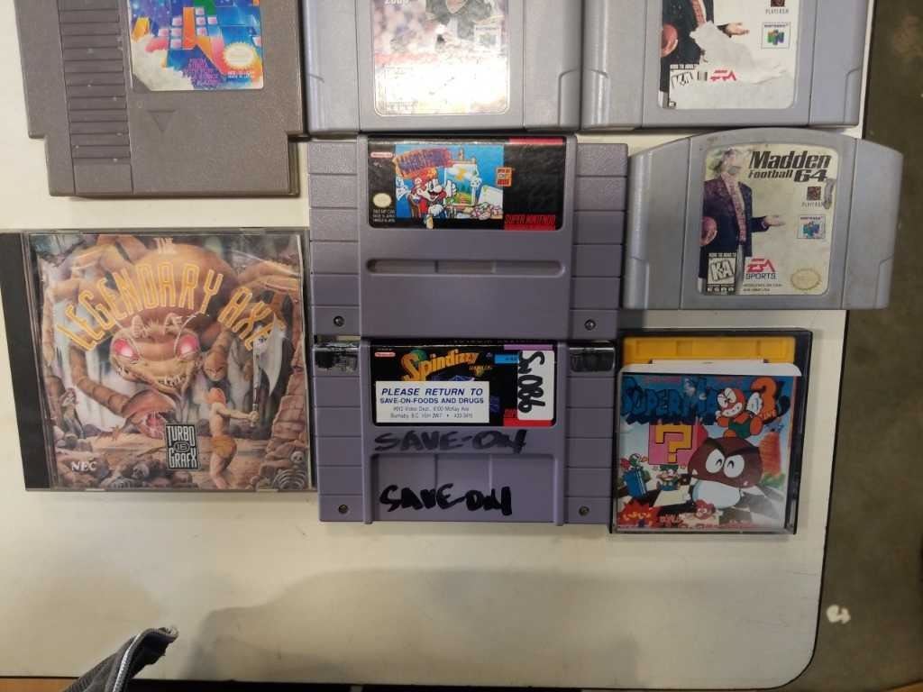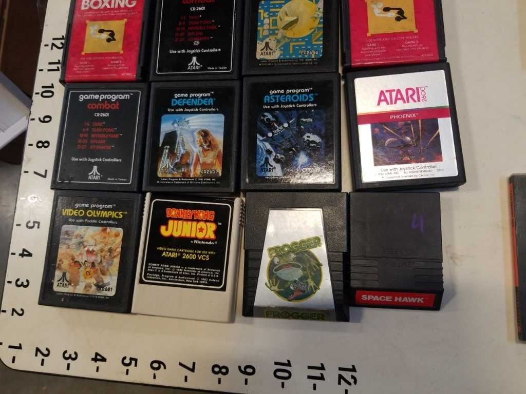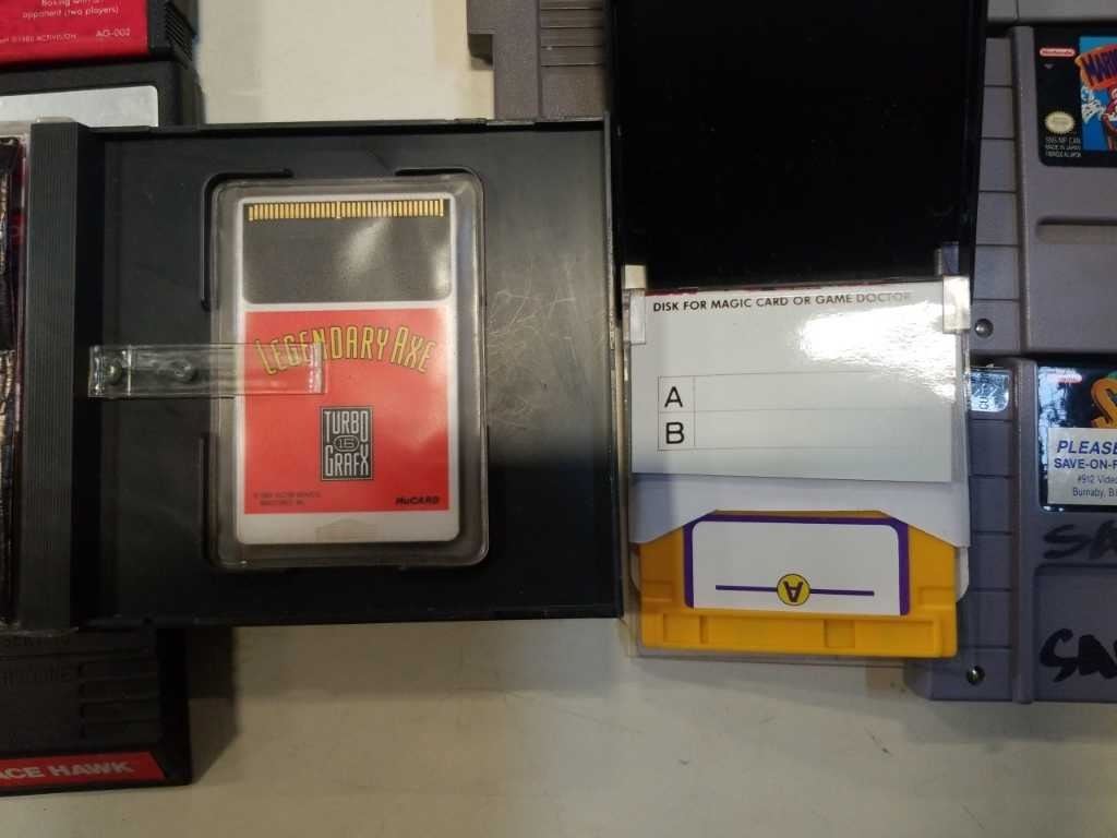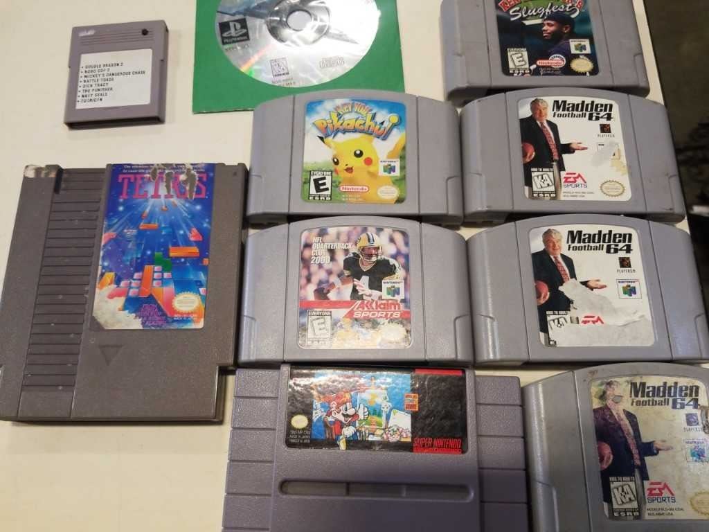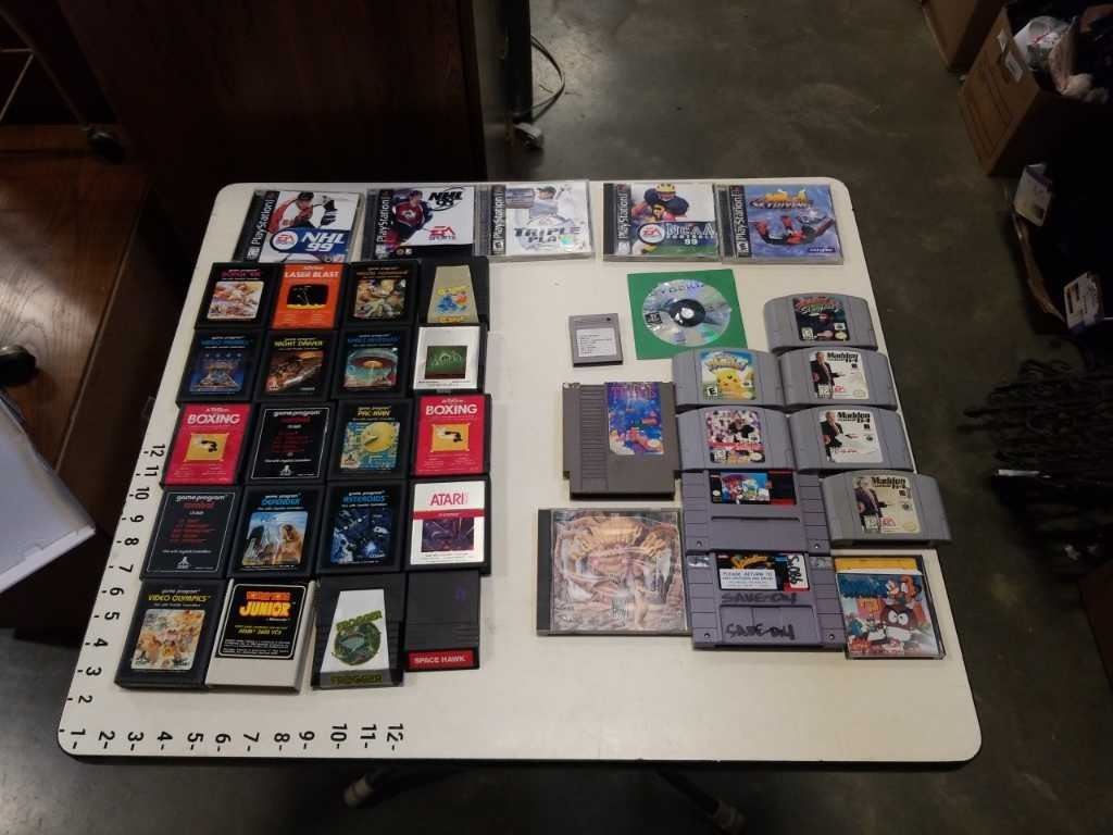 BOX OF VINTAGE VIDEOGAMES, N64, NES, ATARI, PLAYSTATION, TURBO GRAFX 16, GAME DOCTOR FDS DISK