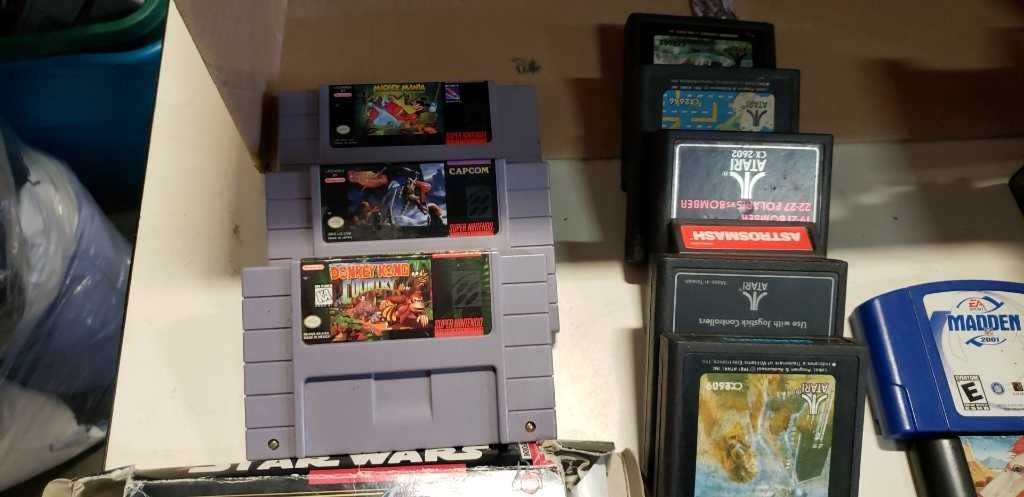 BOX OF VINTAGE VIDEOGAMES, SEGA GENESIS GAMES, SOME WITH ORIGINAL BOXES, NES, ATARI, PS2, SUPER NES