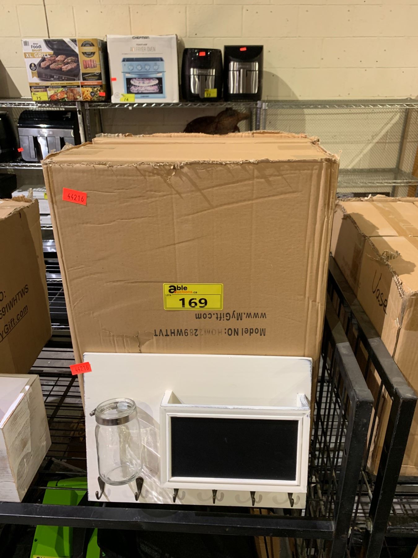 BOX OF VINTAGE WHITE WOOD WALL SHELVES WITH MASON JAR, HOOKS & CHALKBOARD