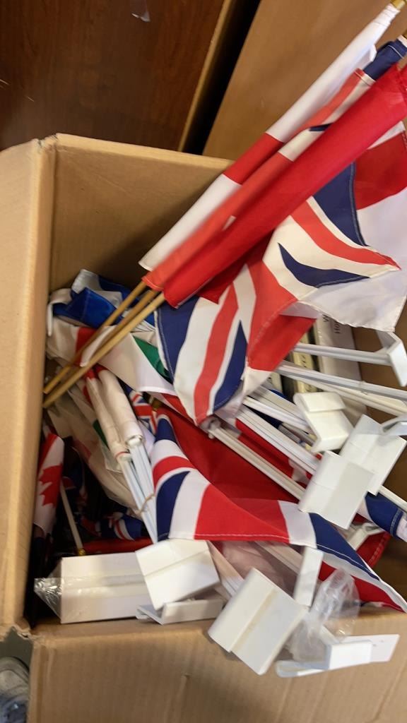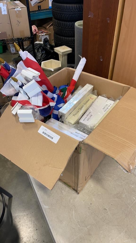 BOX OF WALL CLOCKS AND CAR FLAGS
