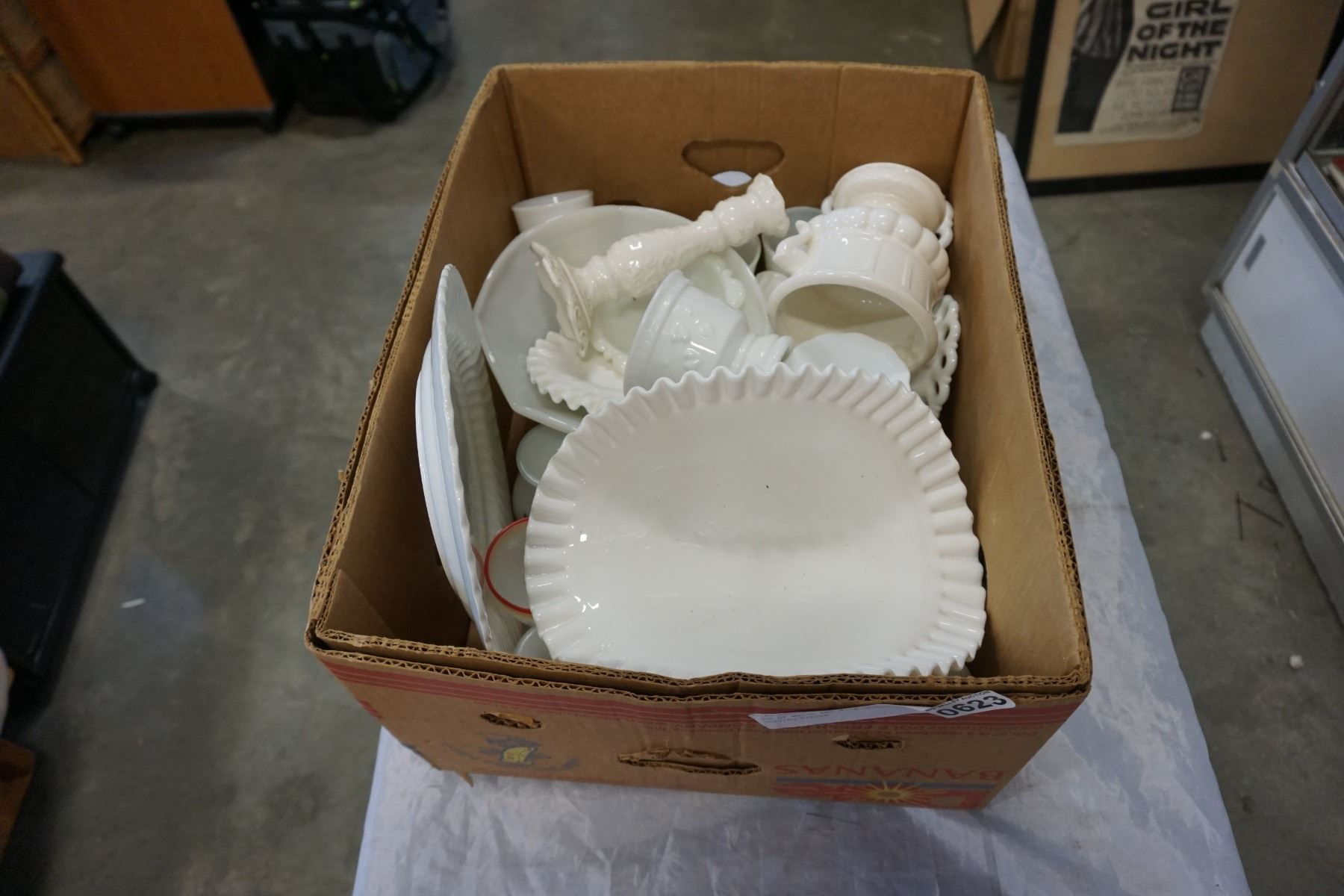 BOX OF WHITE AND MILK GLASS SERVING PIECES