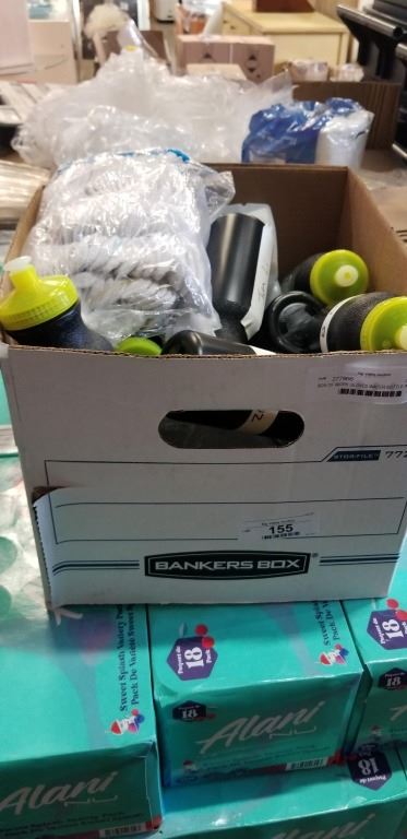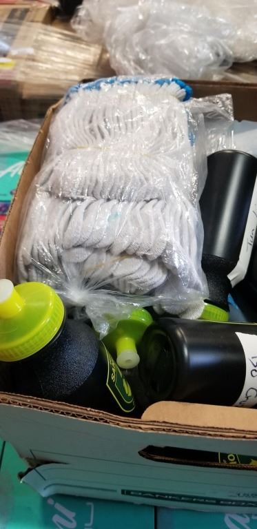 BOX OF WORK GLOVES WATER BOTTLE AND MORE