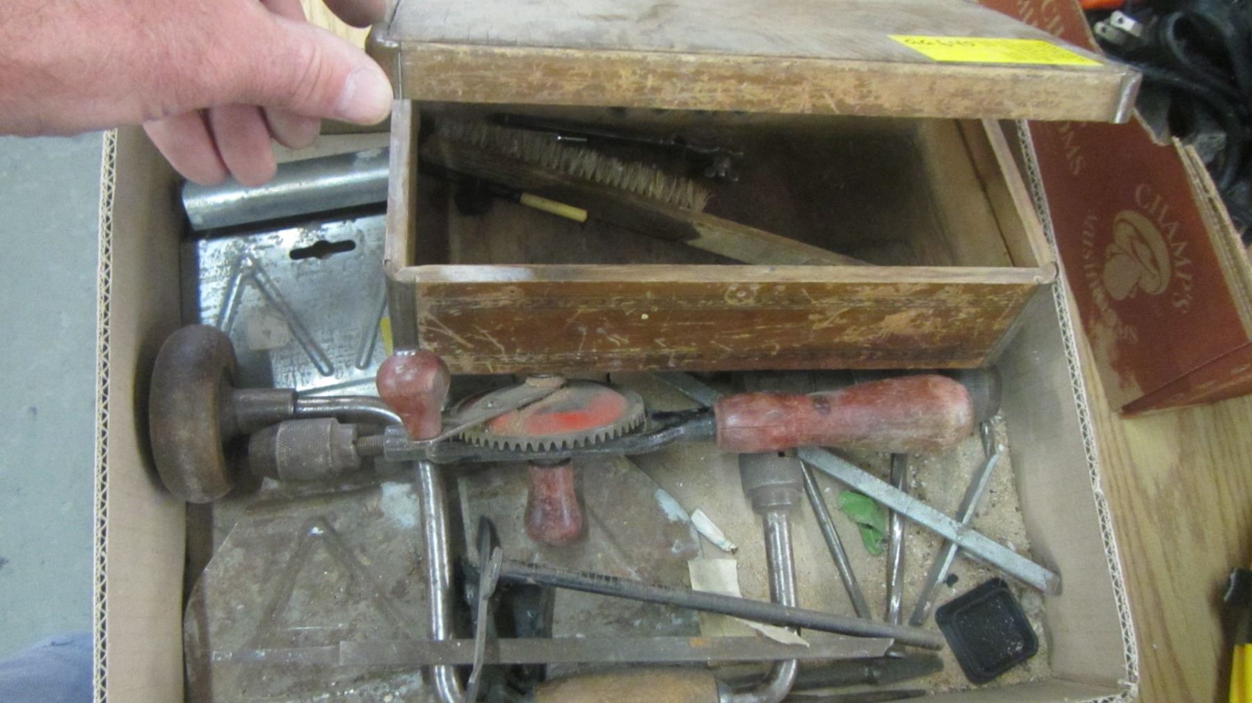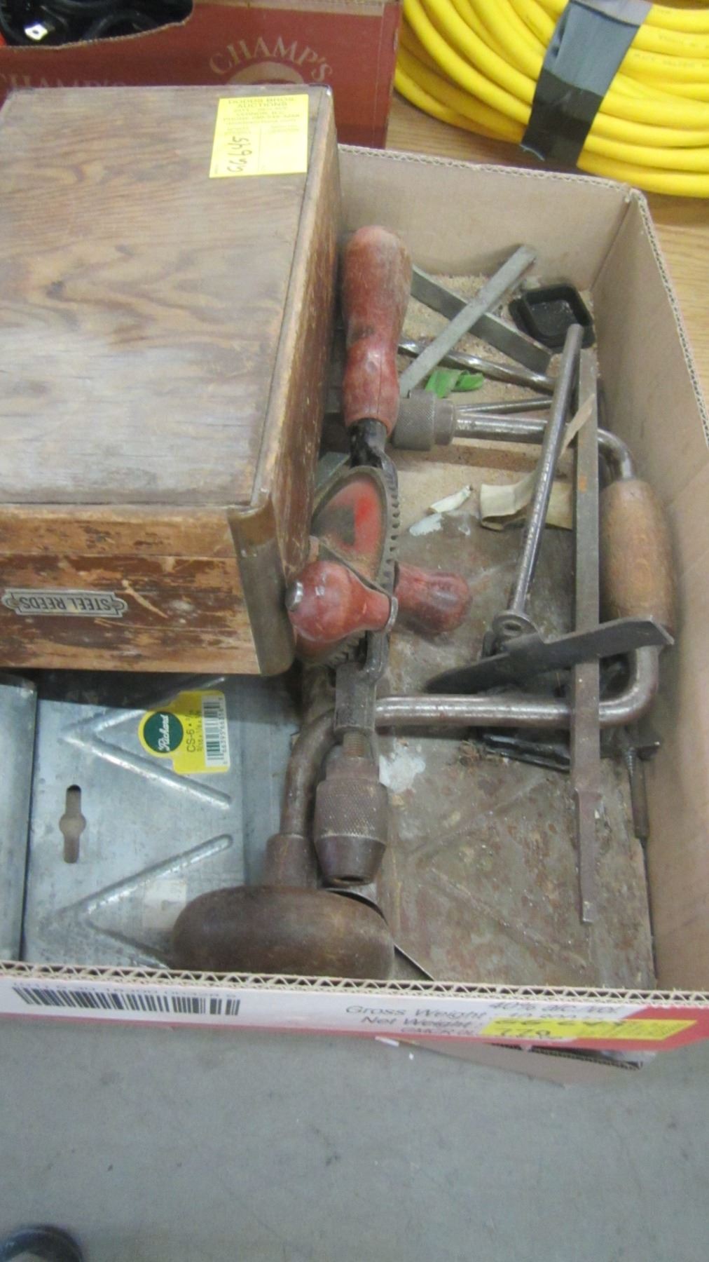 BOX W/MISC. HAND DRILLS, WOODEN BOX, ETC.