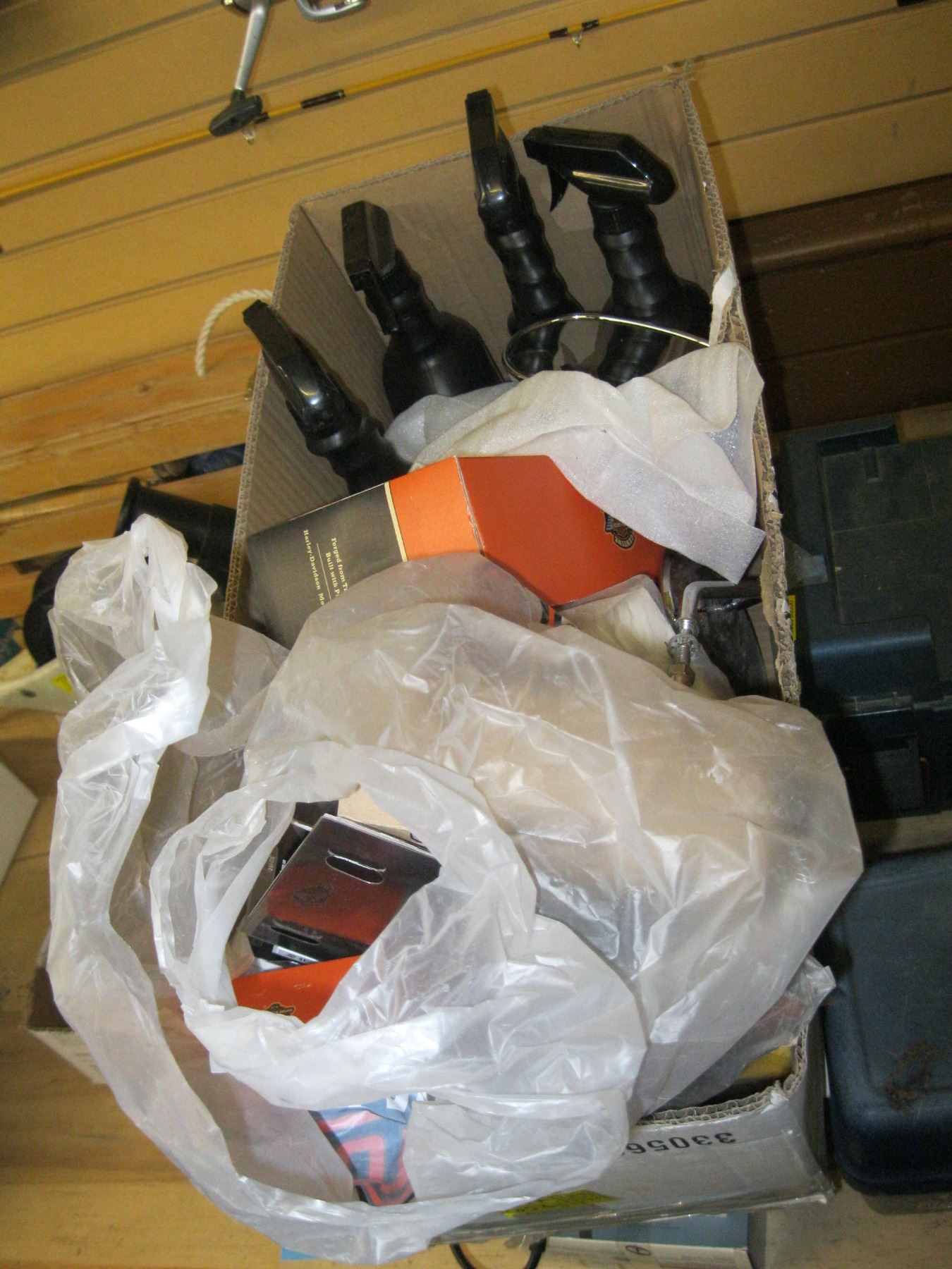 BOX W/MISC. HARLEY DAVIDSON ACCESS., CLEANERS, ETC.