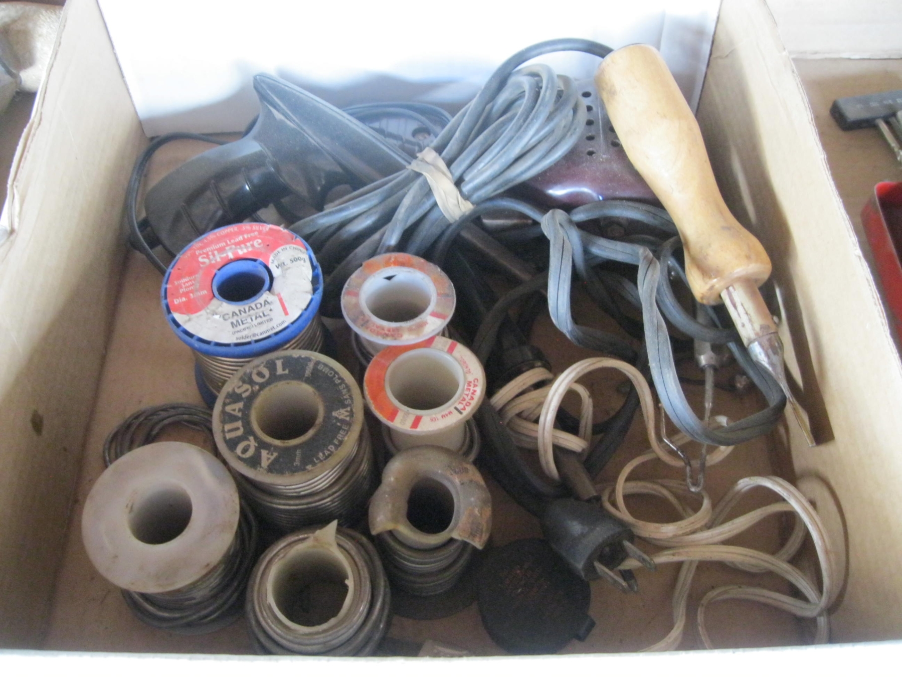 BOX W/SOLDERING IRONS, GUNS & SOLDER
