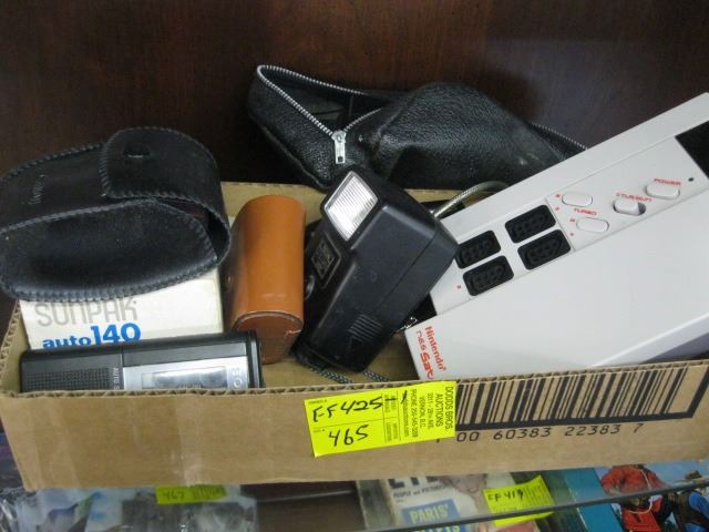 BOX WITH ASSORTED CAMERA FLASHES, DICTAPHONE, NINTENDO ACCESS., ETC.