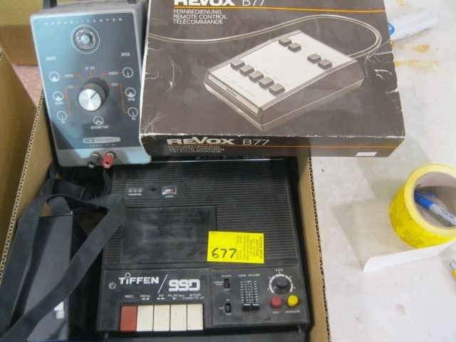 BOX WITH ASST. ELECTRONICS, TAPE DECK, HEATHKIT, TESTER, REVOC B77 REMOTE CONTROL, ETC.