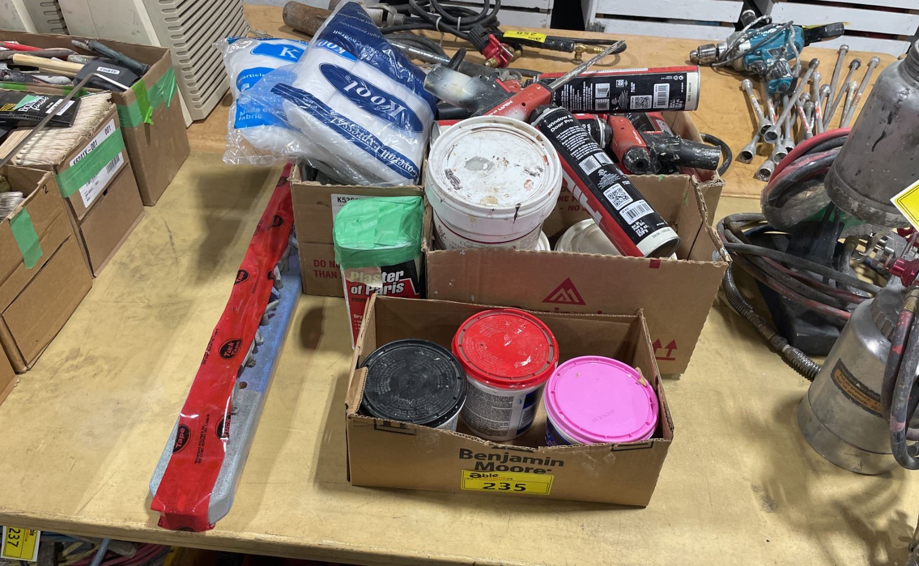 BOXES OF ASSORTED POLISH, PAINT PRODUCTS, PAINT SPRAYER TIPS, HILTI SPRAY GUNS & HILTI WINDOW /