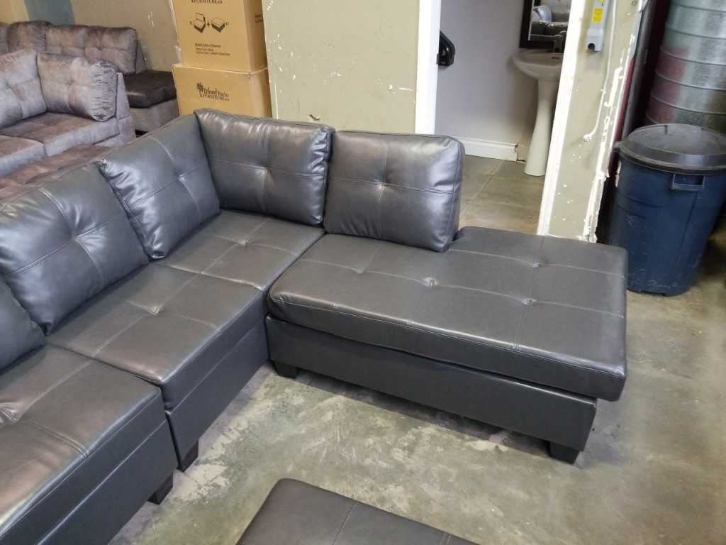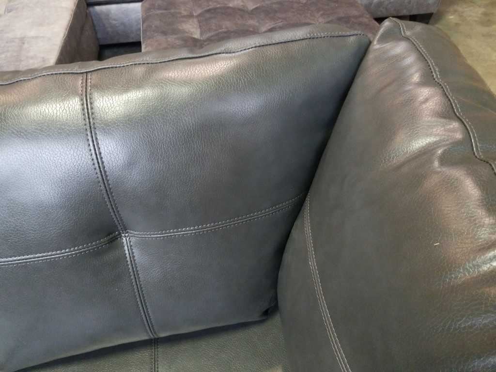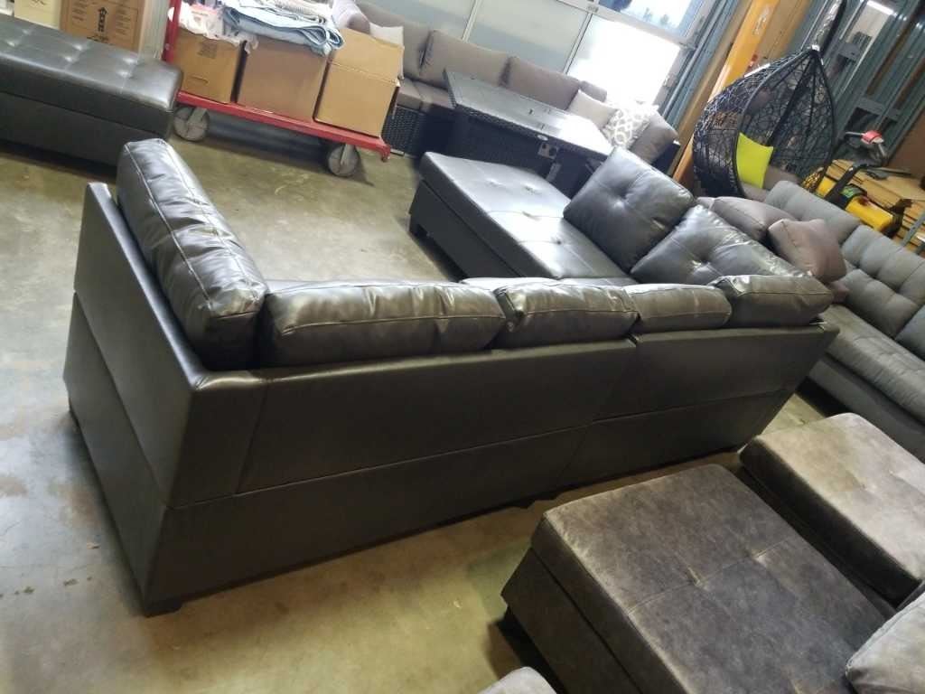 BRAND NEW 4 PIECE GREY AIR LEATHER SECTIONAL SOFA W/ REVERSIBLE CHAISE AND STORAGE OTTOMAN - RETAIL $1999