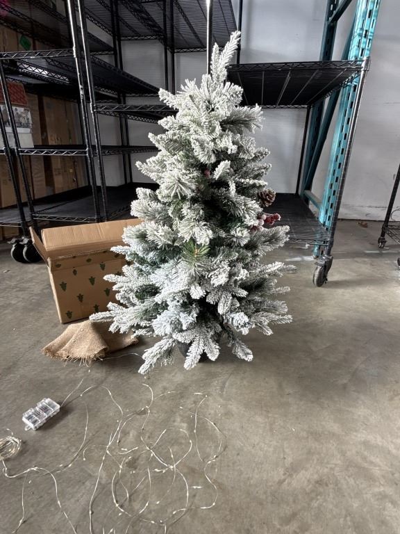 BRAND NEW 40 INCH FLOCKED INDOOR / OUTDOOR CHRISTMAS TREE, IN BLACK POT WITH BURLAP WRAP, AND SET OF LED STRING LIGHTS WITH BATTERY PACK