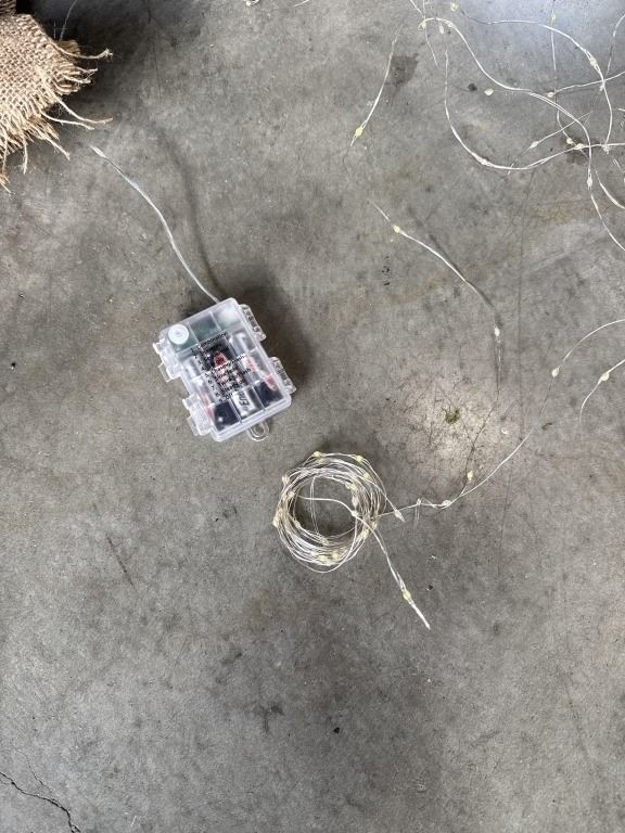 BRAND NEW 40 INCH FLOCKED INDOOR / OUTDOOR CHRISTMAS TREE, IN BLACK POT WITH BURLAP WRAP, AND SET OF LED STRING LIGHTS WITH BATTERY PACK