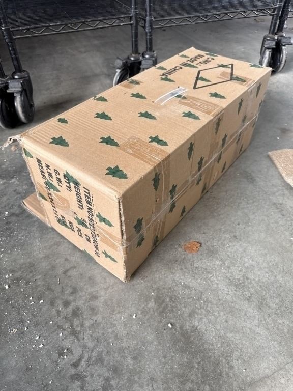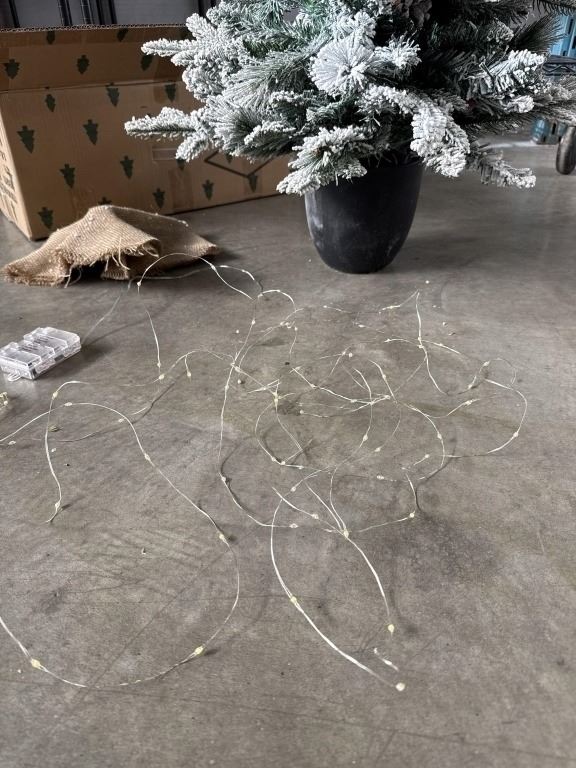 BRAND NEW 40 INCH FLOCKED INDOOR / OUTDOOR CHRISTMAS TREE, IN BLACK POT WITH BURLAP WRAP, AND SET OF LED STRING LIGHTS WITH BATTERY PACK