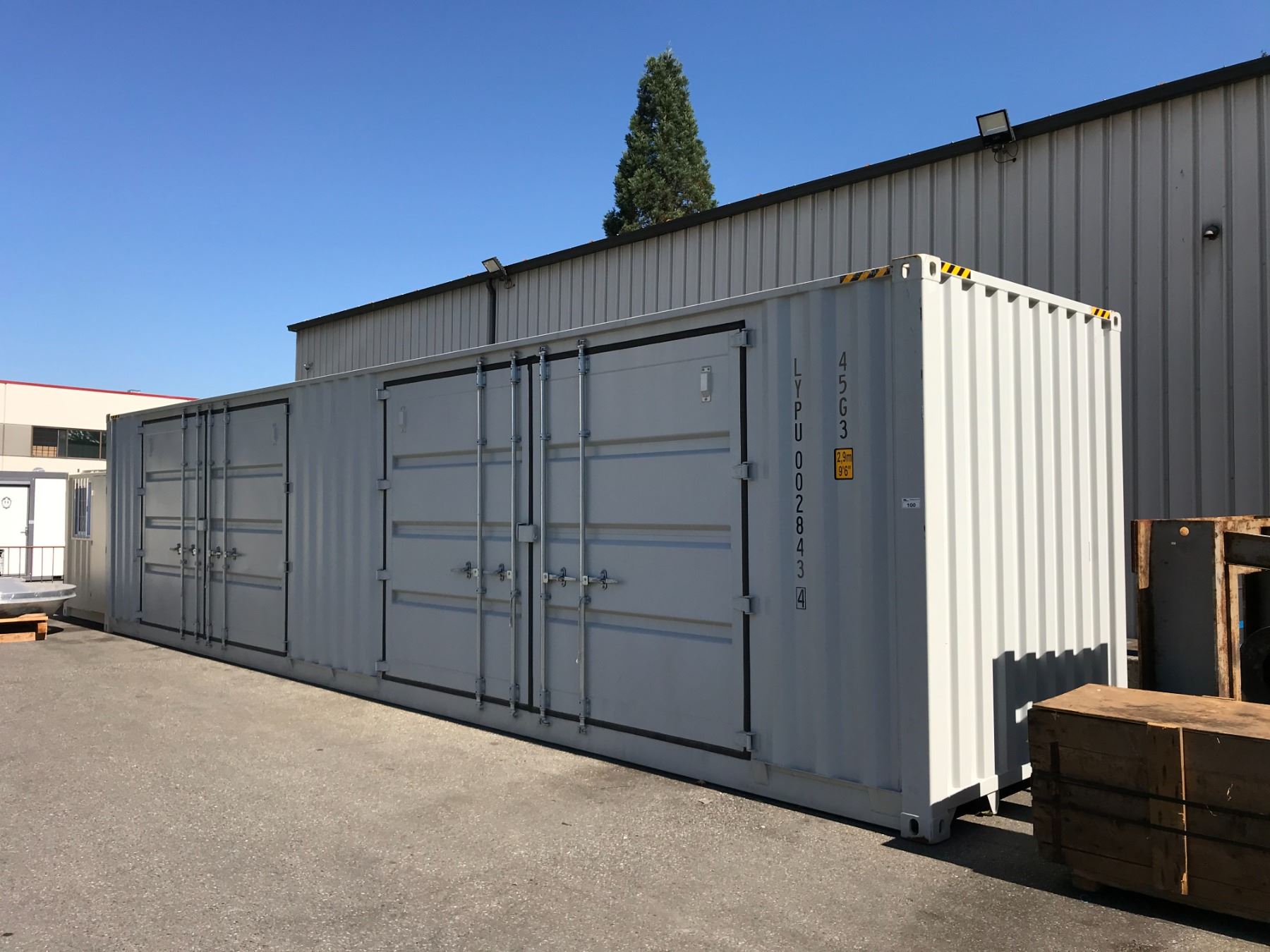 BRAND NEW 40' SHIPPING CONTAINER WITH 2 LARGE SIDE DOUBLE SWING DOORS AND 1 REAR DOUBLE SWING DOOR