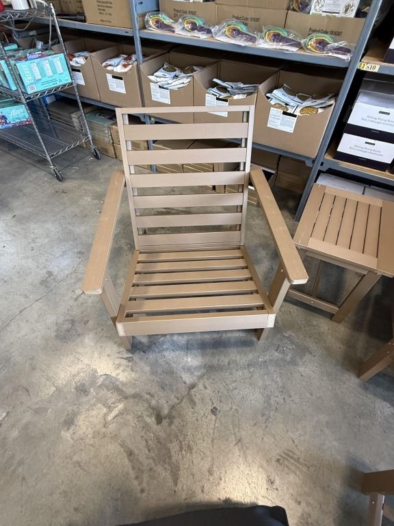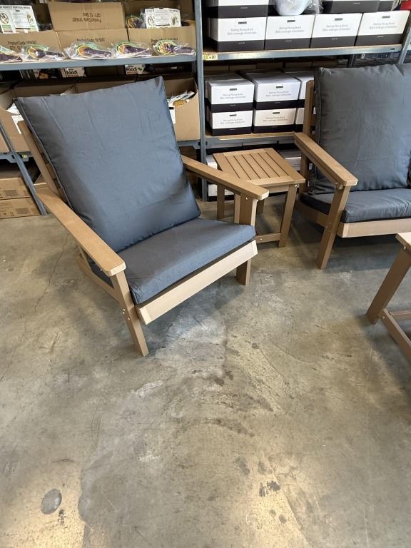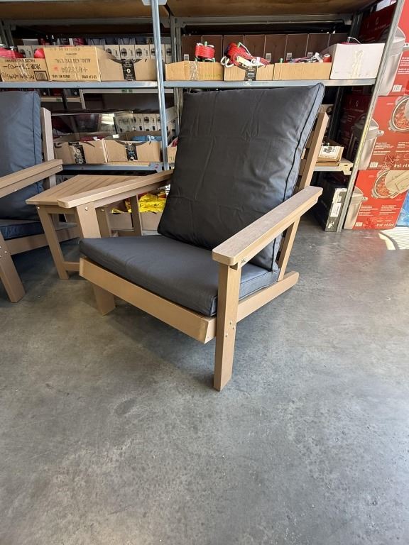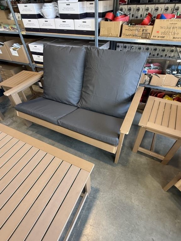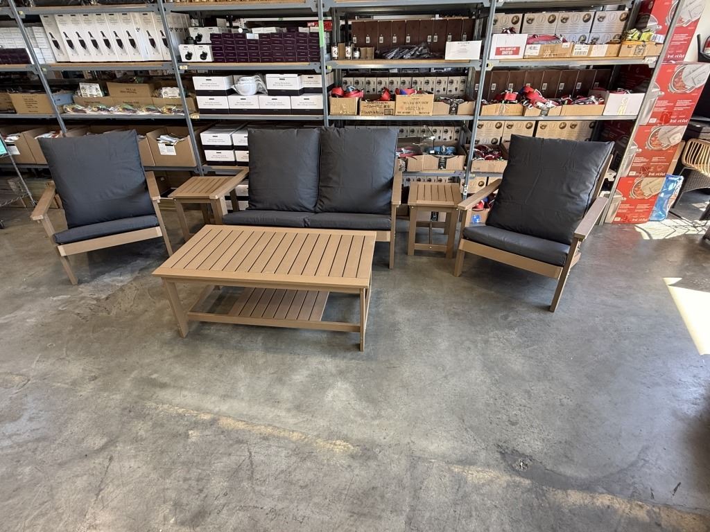 BRAND NEW 6PC ADIRONDACK STYLE PATIO SET, IN DARK GREY / BROWN, 2 CHAIRS, LOVESEAT, 2 SIDE TABLES AN