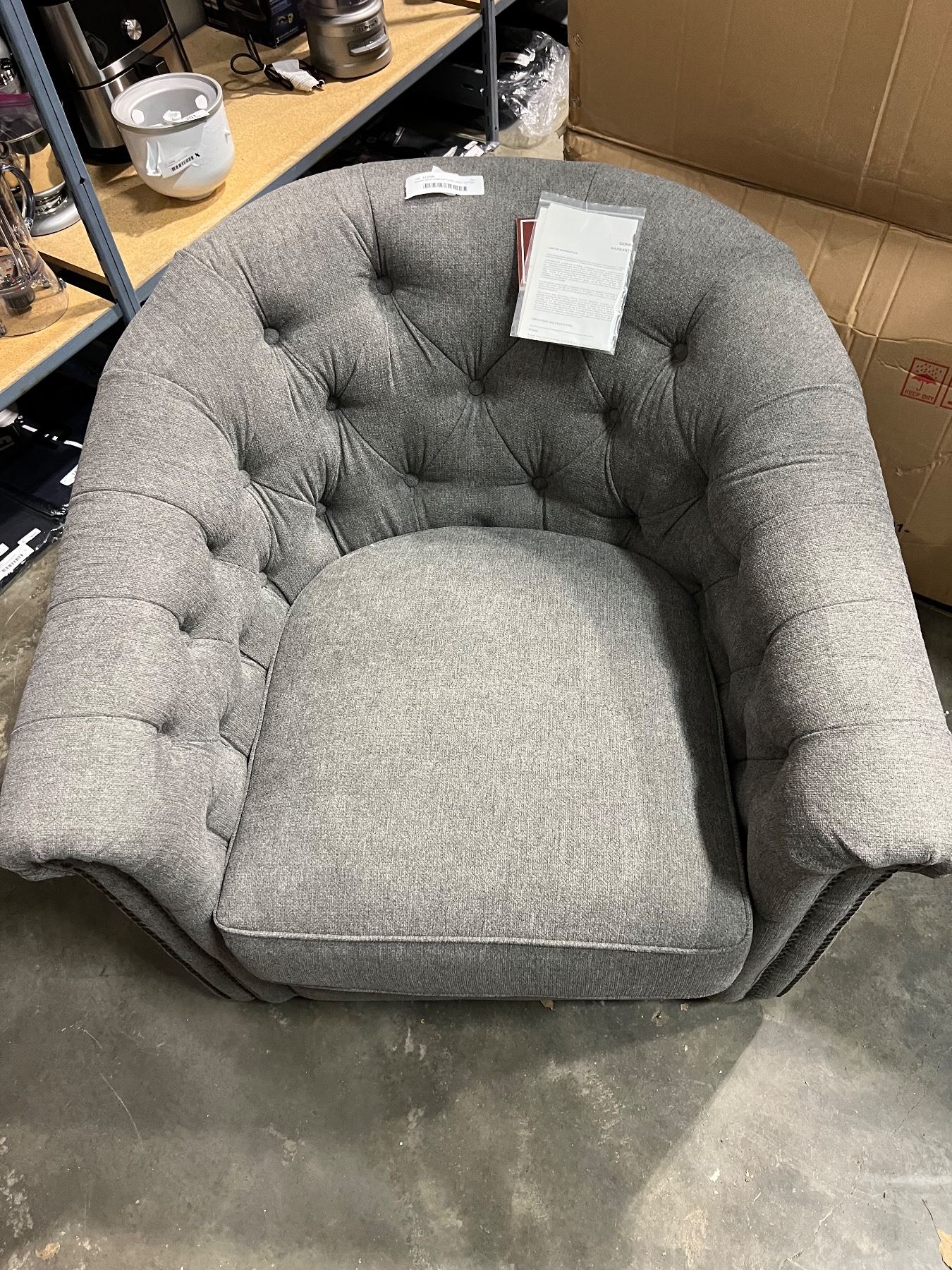 BRAND NEW COMFORTLAND GREY TUFTED SWIVEL ACCENT CHAIR - RETAIL $899 W/ GEL AND FEATHER CUSHION FOR E