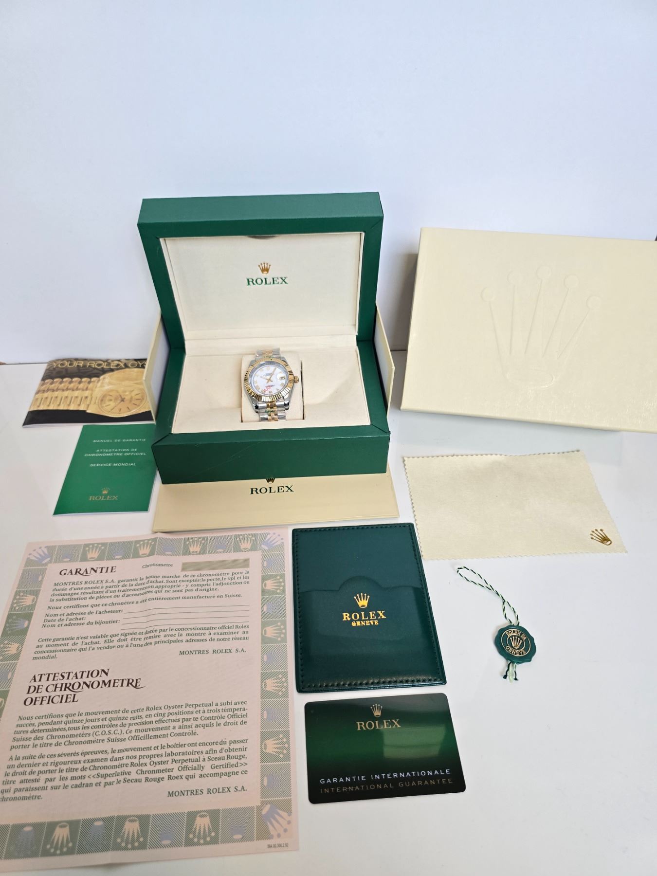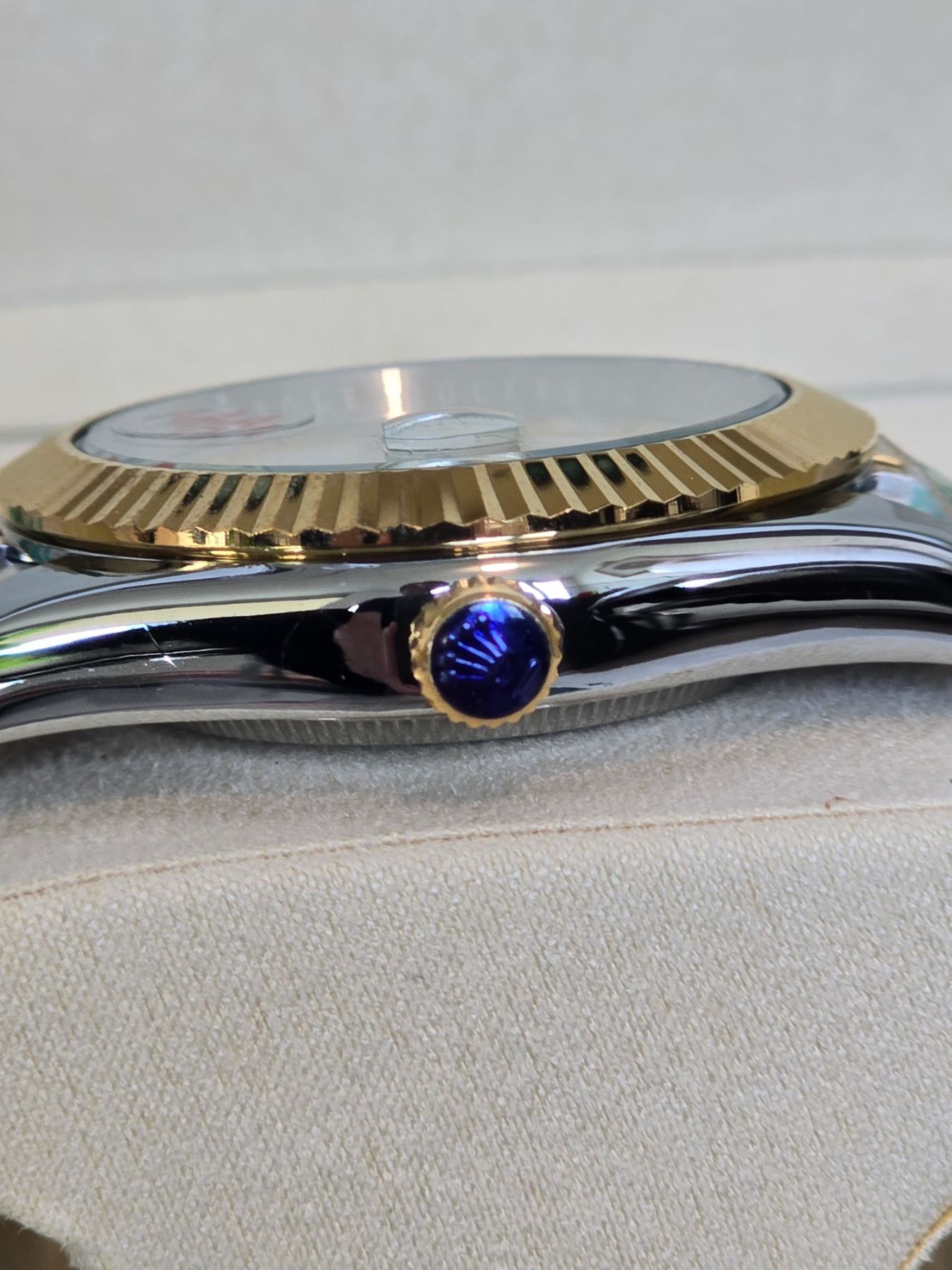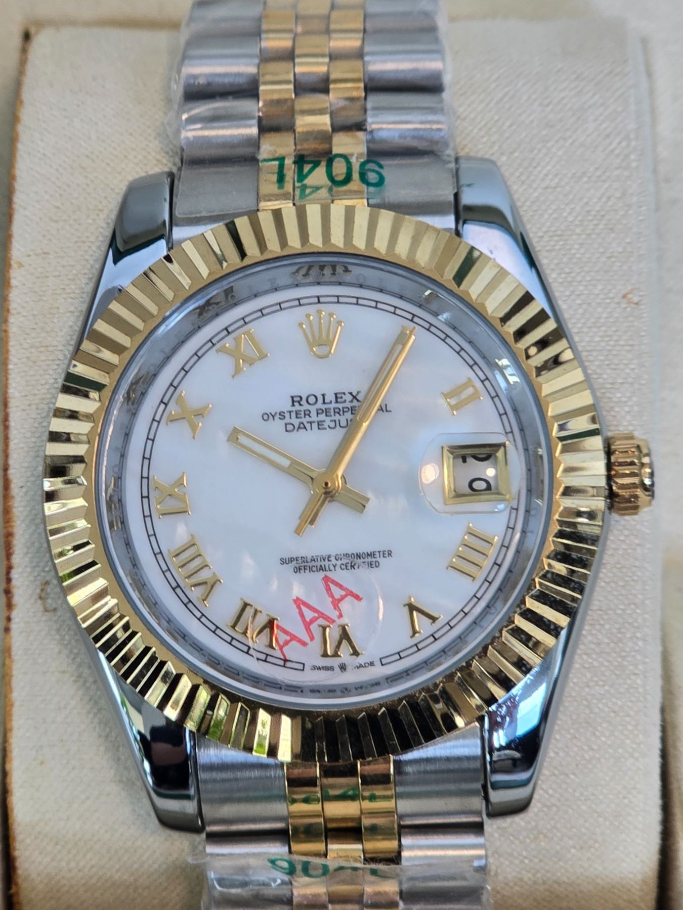 BRAND NEW FULLY AUTOMATIC ROLEX DATEJUST 41 MM AAA QUALITY REPLICA WATCH WHITE MOTHER OF PEARL DIAL WITH GOLDEN ROMAN NUMERALS INDEXES, GOLD FLUTED BEZEL AND CROWN, 904L STAINLESS STEEL CASE (THE SAME STEEL USED IN AUTHENTIC ROLEX WATCHES) 2 TONE JUBILEE BRACELET. FULL SET WITH BOX, PAPERS & BAG