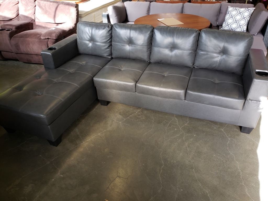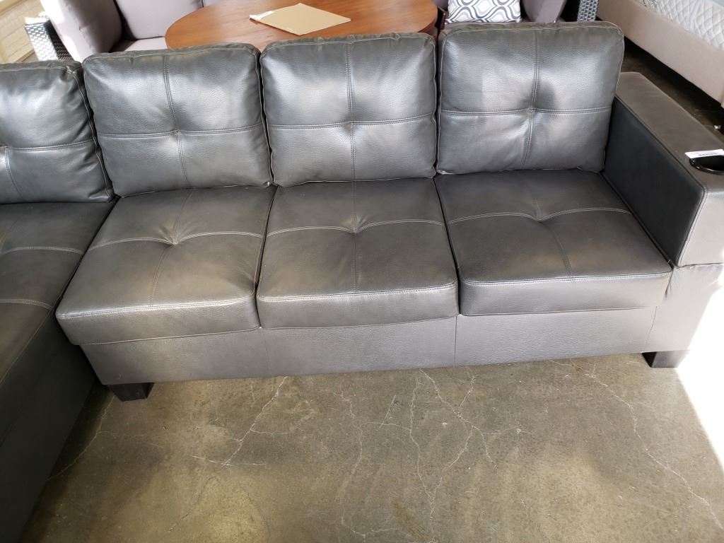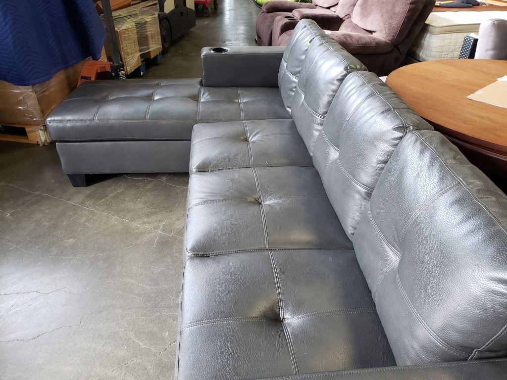 BRAND NEW GREY AIR LEATHER 2 PC SECTIONAL SOFA W/ CUPHOLDERS, AND REMOVABLE PILLOW BACKS, RETAIL $1399 95 INCHES WIDE, BY 60 DEEP CHAISE