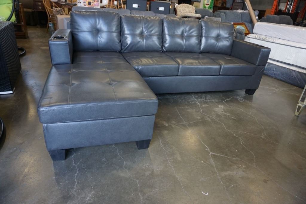 BRAND NEW GREY AIR LEATHER 2 PC SECTIONAL SOFA W/ CUPHOLDERS, AND REMOVABLE PILLOW BACKS, RETAIL $1399 95 INCHES WIDE, BY 60 DEEP CHAISE - LEFT FACING
