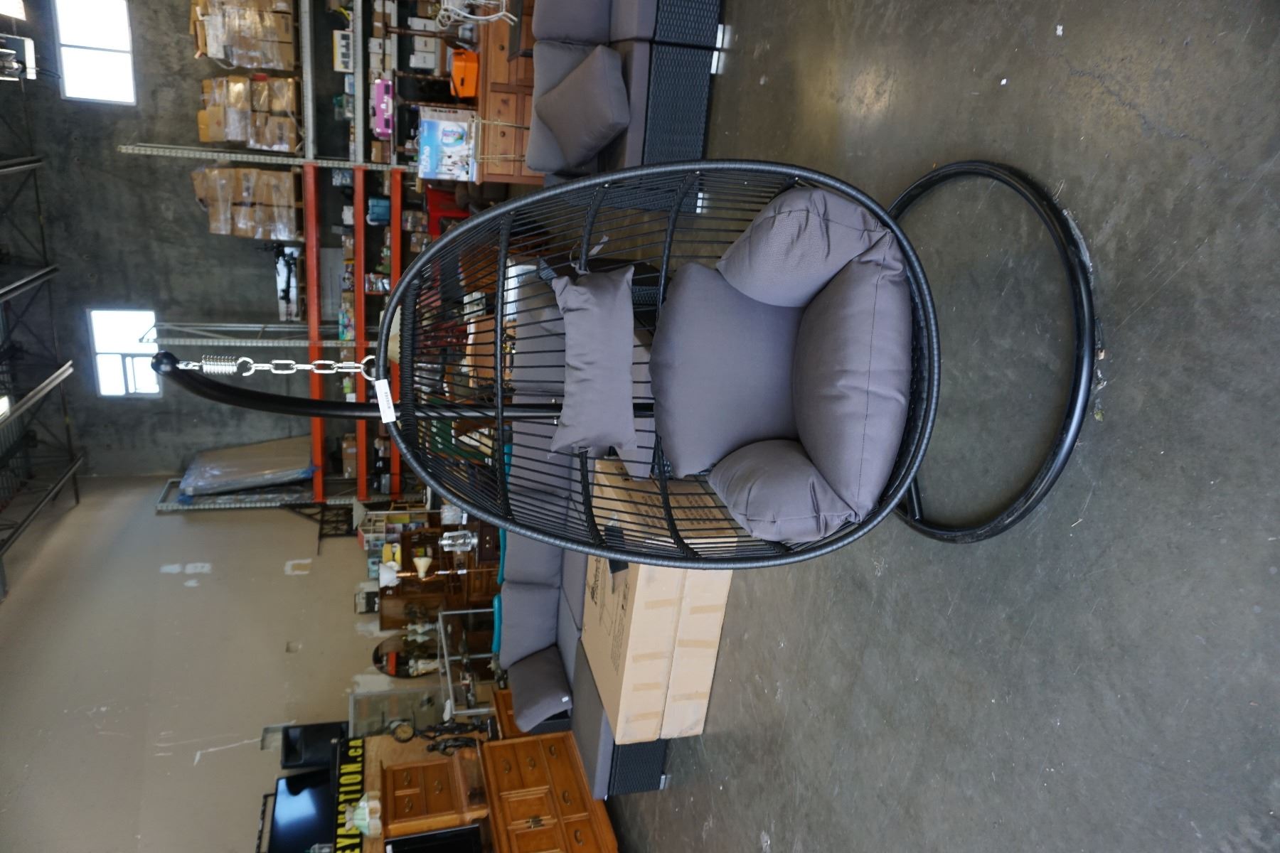 BRAND NEW GREY CUSHION HANGING EGG CHAIR - RETAIL $949 W/ NECK PILLOW, FOLDABLE FRAME, POWDER COATED STEEL FRAME, RATED FOR 300LBS