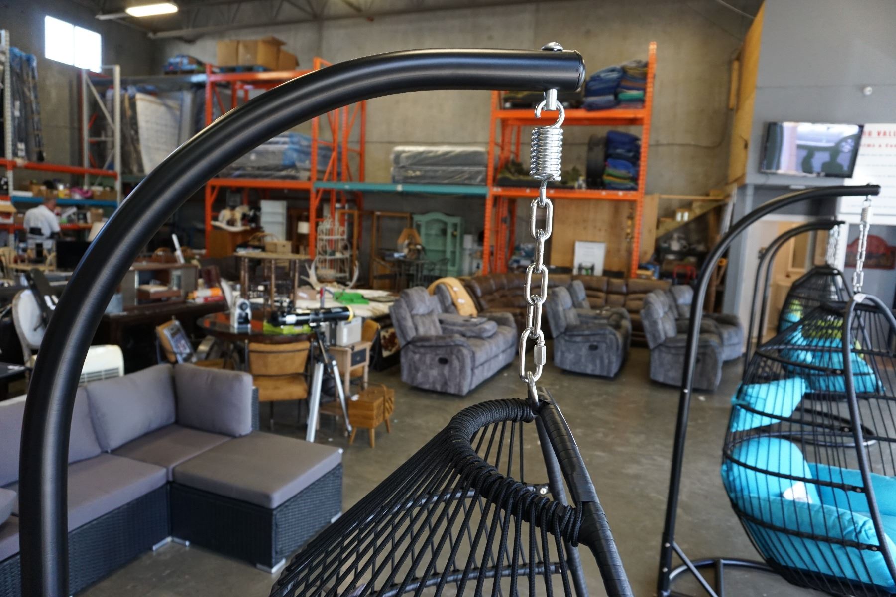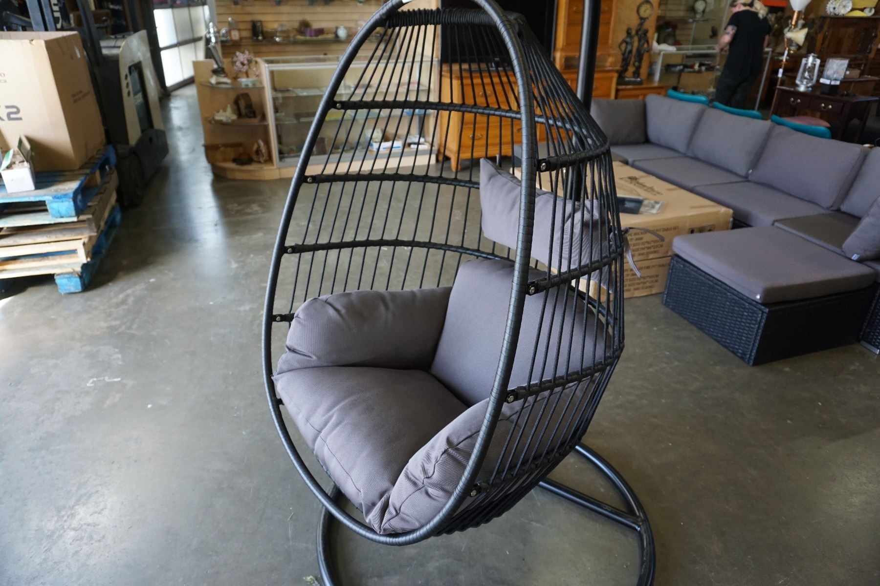 BRAND NEW GREY CUSHION HANGING EGG CHAIR - RETAIL $949 W/ NECK PILLOW, FOLDABLE FRAME, POWDER COATED