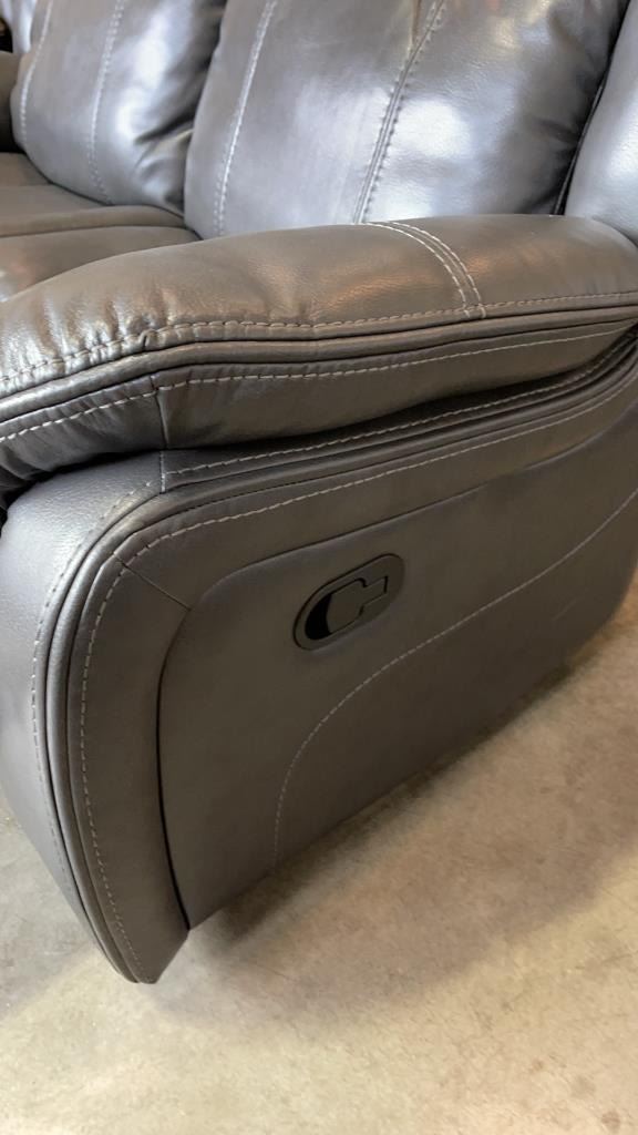 BRAND NEW GREY LEATHER RECLINING LOVE SEAT - RETAIL $699