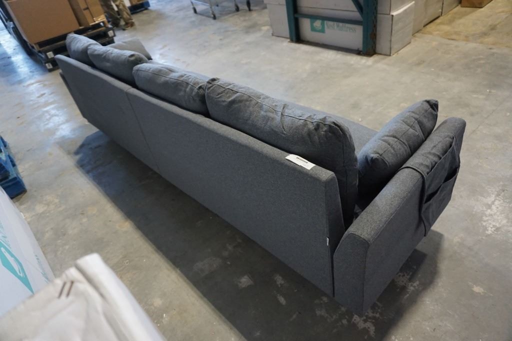 BRAND NEW GREY PILLOWBACK SOFA - 107 INCHES WIDE, 28 INCHES DEEP, 28 INCHES TALL