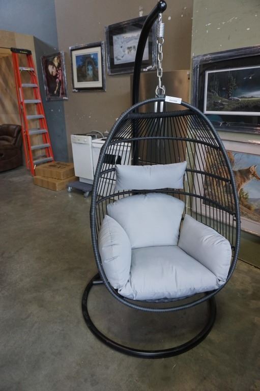 BRAND NEW GREY SINGLE HANGING EGG CHAIR - RETAIL $949 W/ NECK PILLOW, FOLDABLE FRAME, POWDER COATED