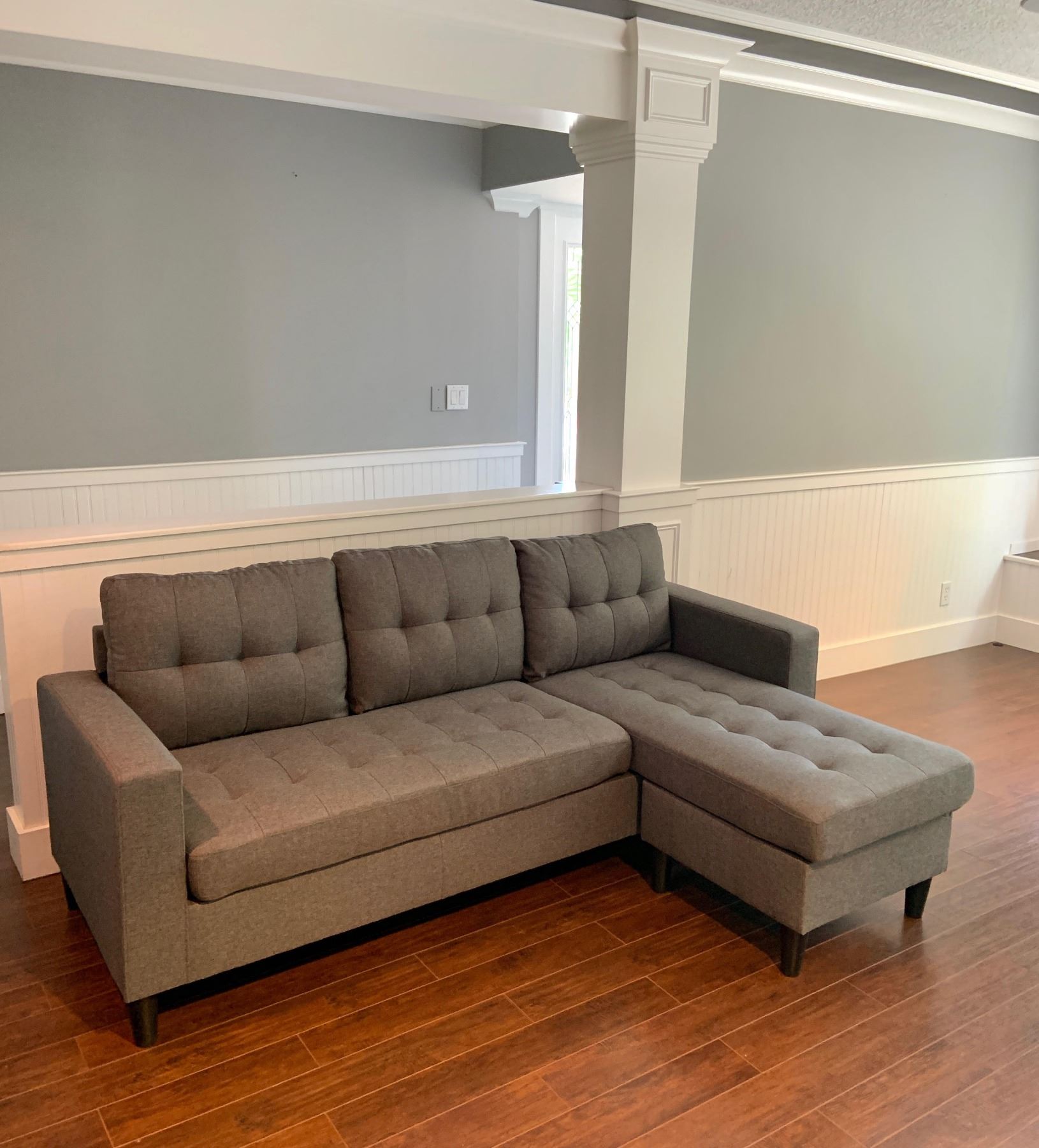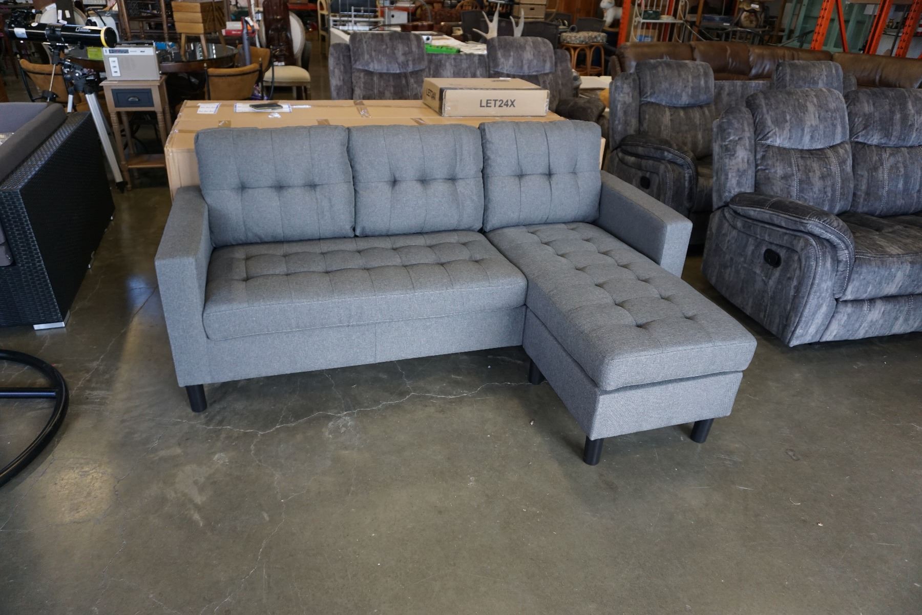 BRAND NEW GREY TUFTED REVERSIBLE SECTIONAL SOFA - RETAIL $899 COTTON LINEN FABRIC 5' X 7'