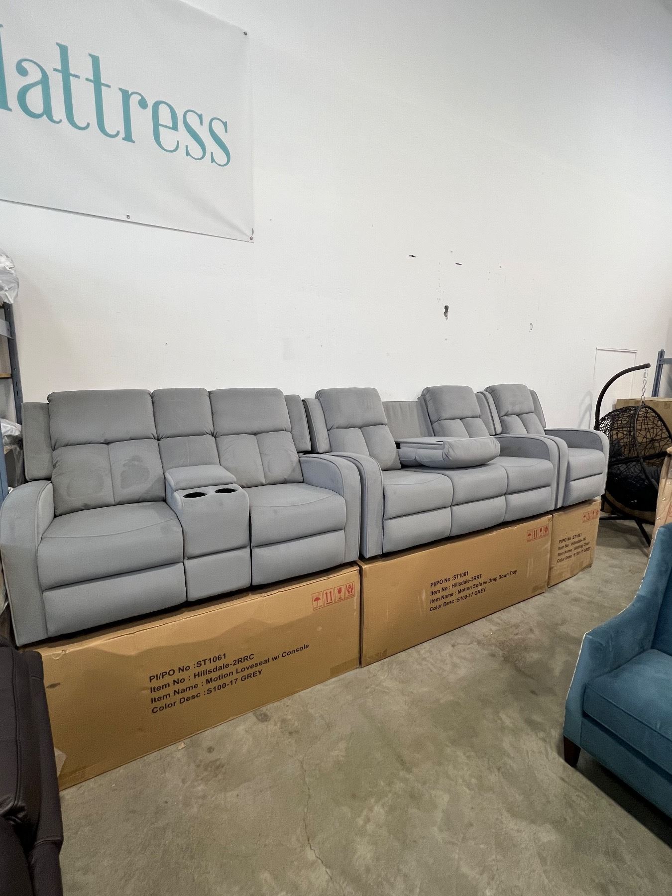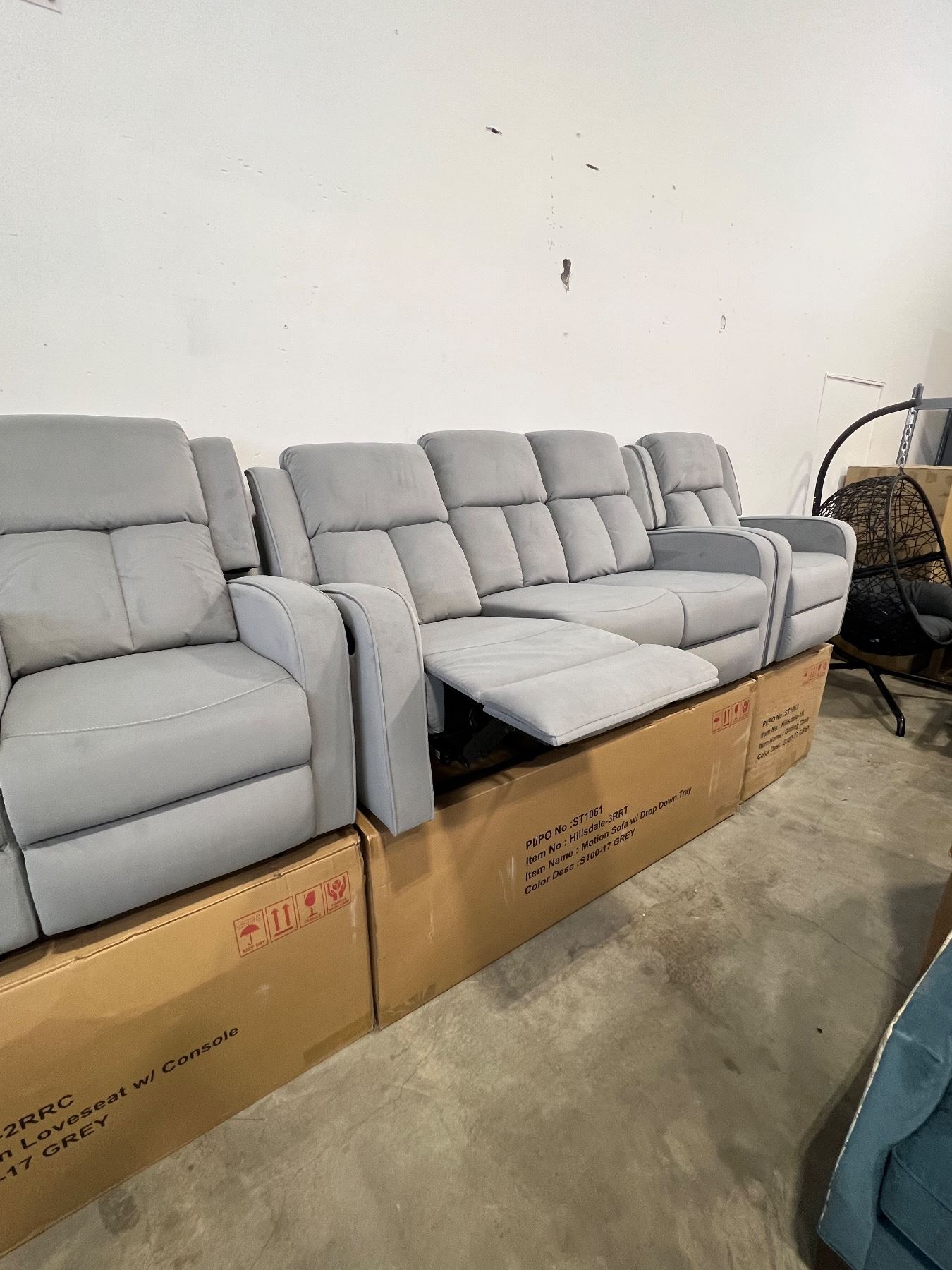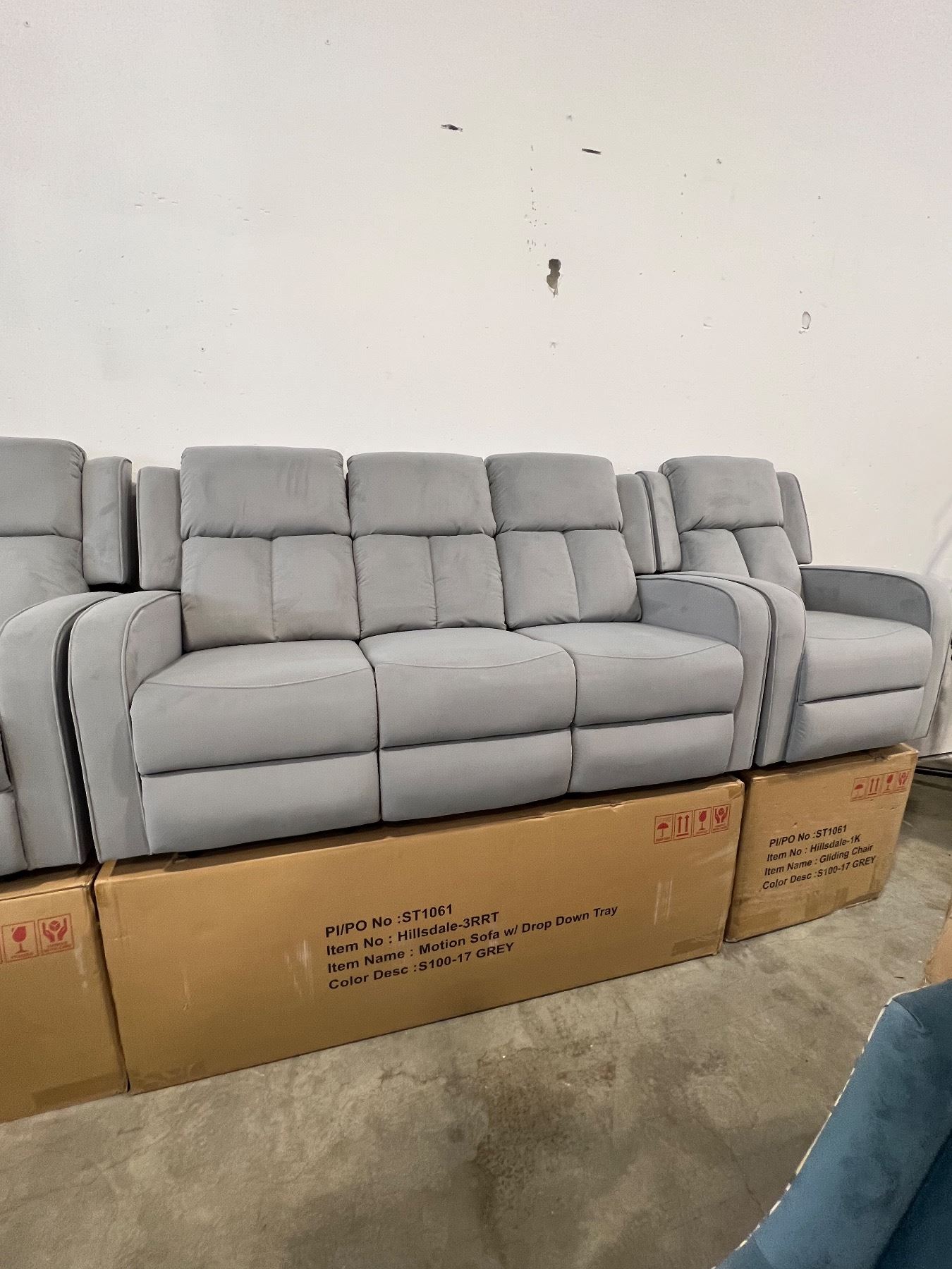 BRAND NEW HILLSDALE 3PC GREY FABRIC RECLINING SOFA SET W/ CONSOLES - RETAIL $3899, CHAIR IS ROCKER, GLIDER AND RECLINING, LOVESEAT W/ 2 RECLINERS AND CONSOLE, SOFE W/ DROP CONSOLE AND 2 RECLINERS