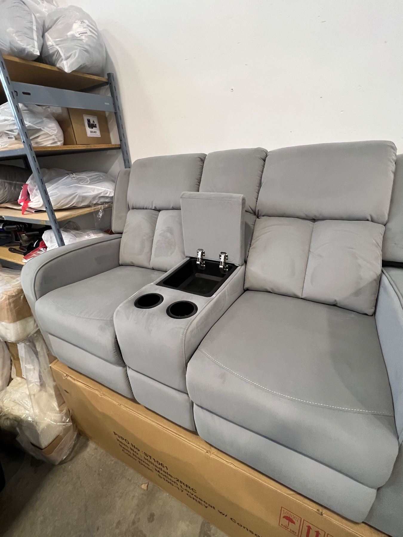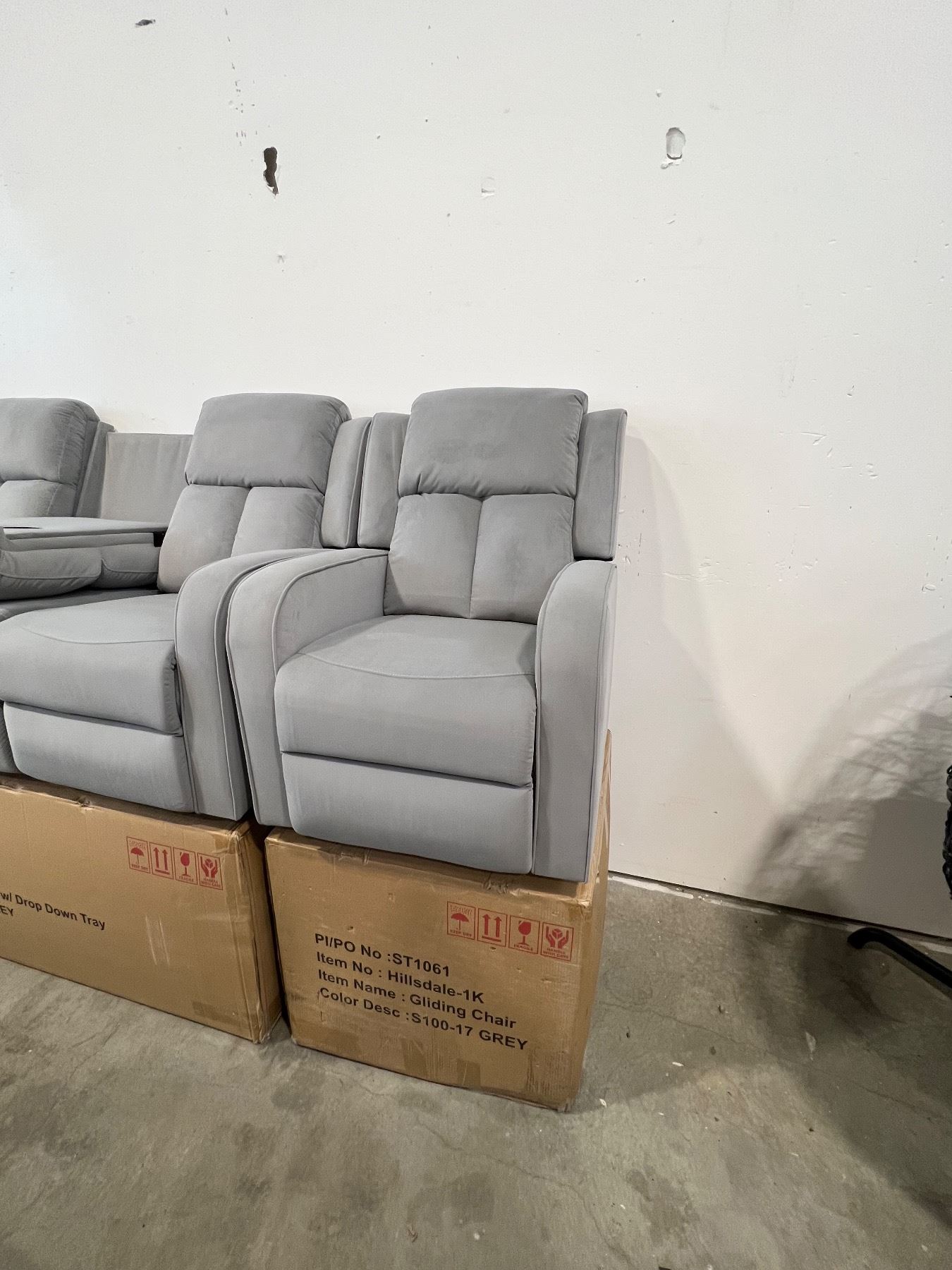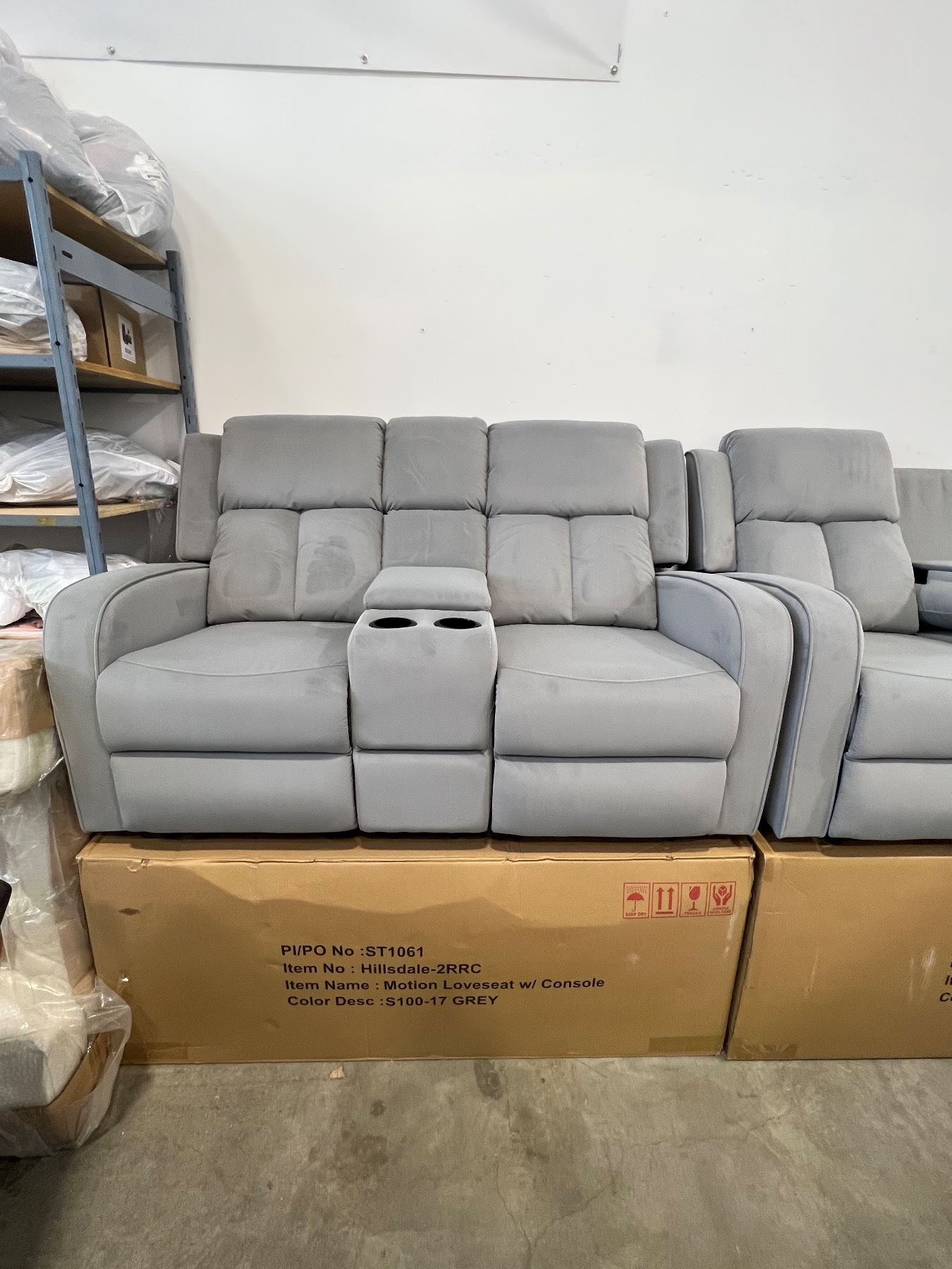 BRAND NEW HILLSDALE 3PC GREY FABRIC RECLINING SOFA SET W/ CONSOLES - RETAIL $3899, CHAIR IS ROCKER, GLIDER AND RECLINING, LOVESEAT W/ 2 RECLINERS AND CONSOLE, SOFE W/ DROP CONSOLE AND 2 RECLINERS