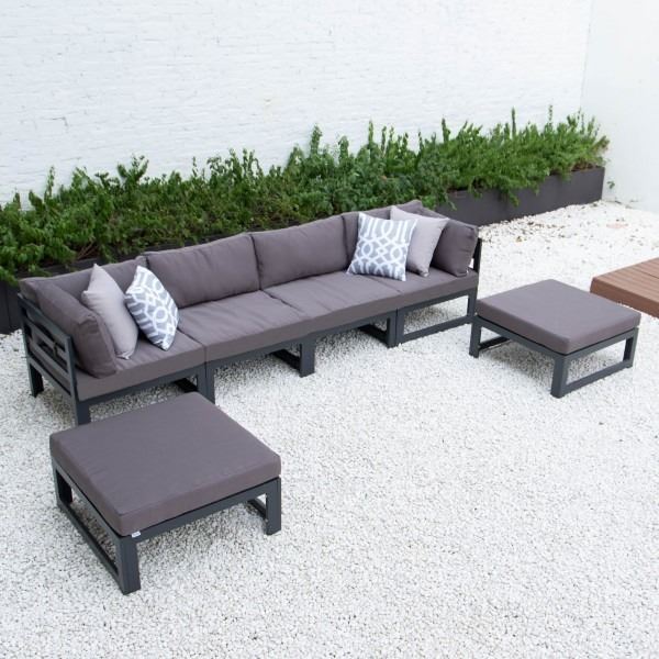 BRAND NEW LUXURY SLATTED ALUMINUM 6 PIECE OUTDOOR MODULAR SOFA SET W/ DARK GREY CUSHIONS - RETAIL $2
