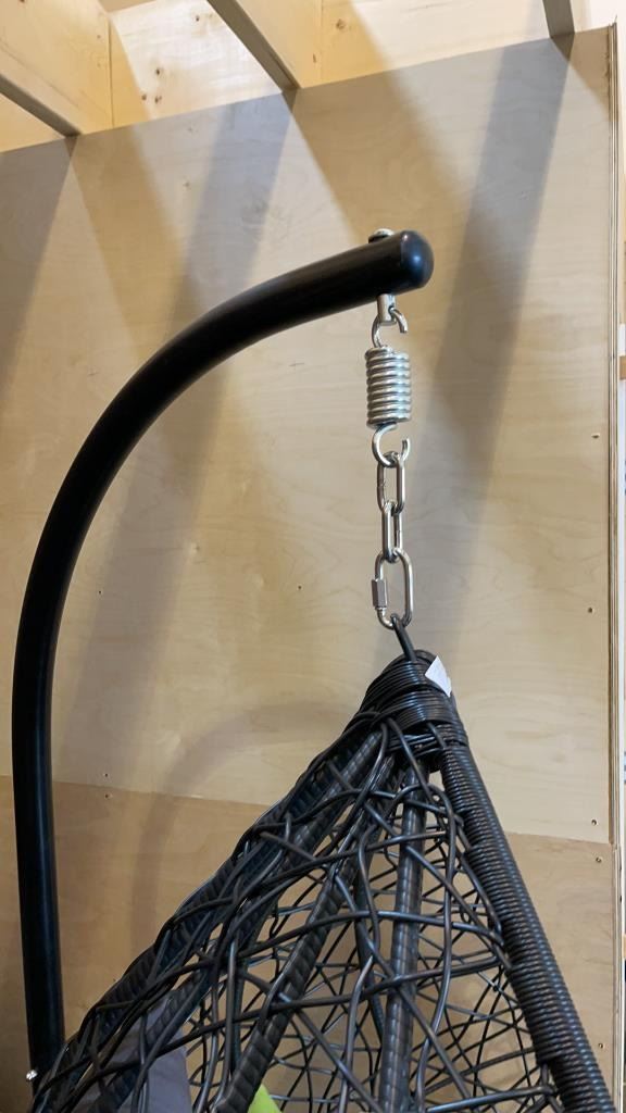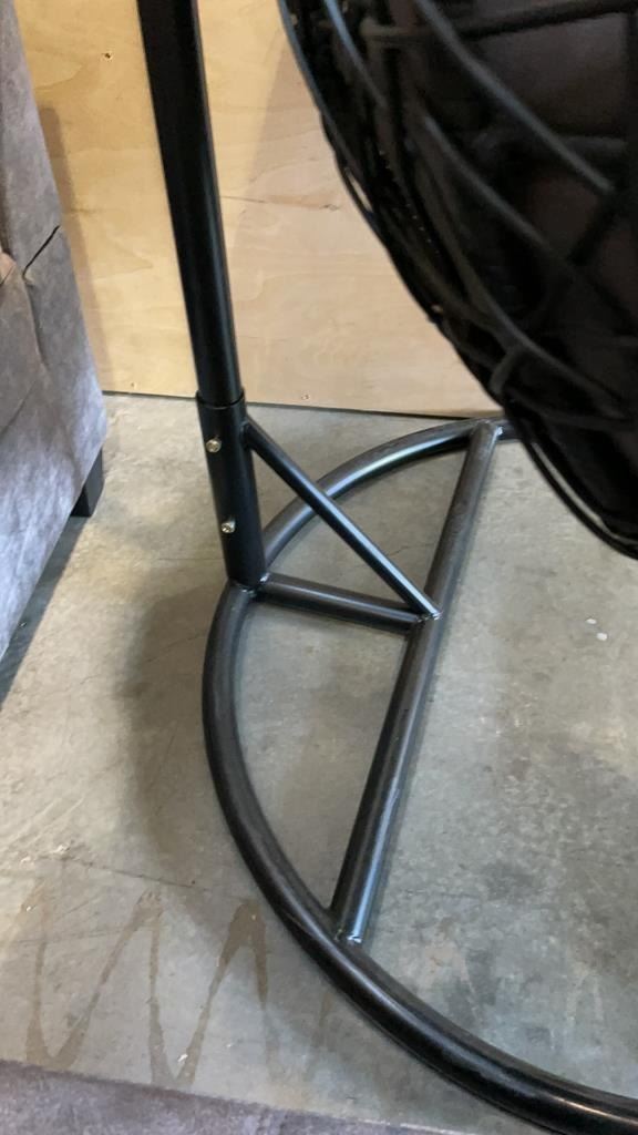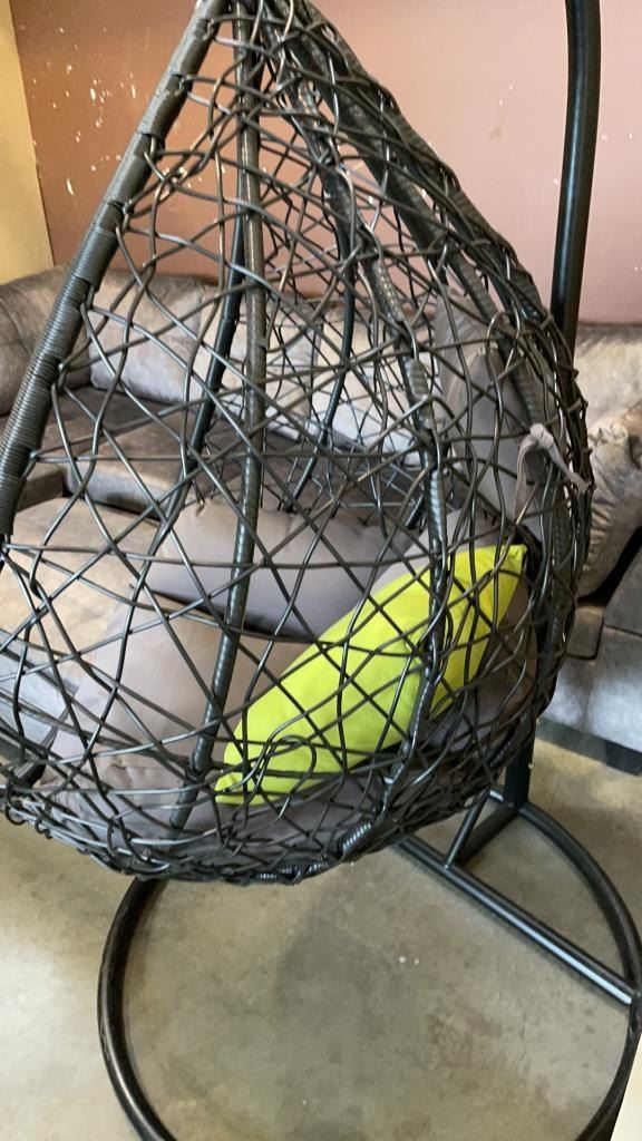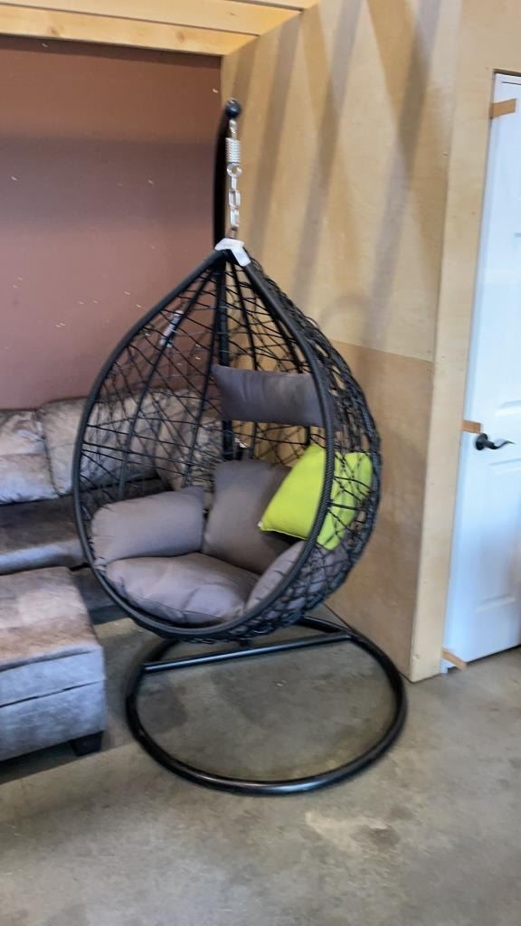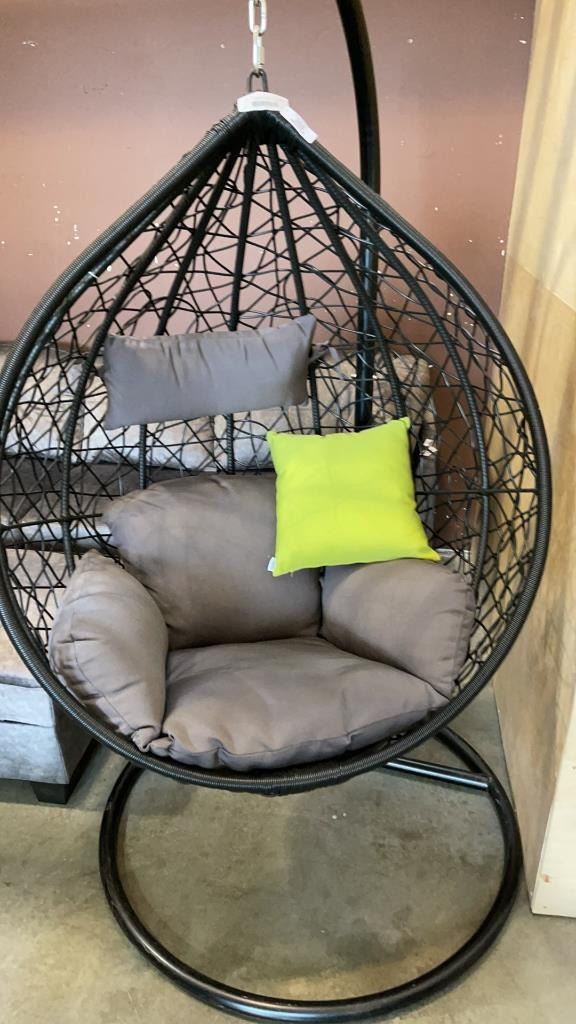 BRAND NEW MODERN RATTAN OUTDOOR TEAR DROP HANGING EGG CHAIR RETAIL $949 W/ GREY CUSHIONS - UV AND WA