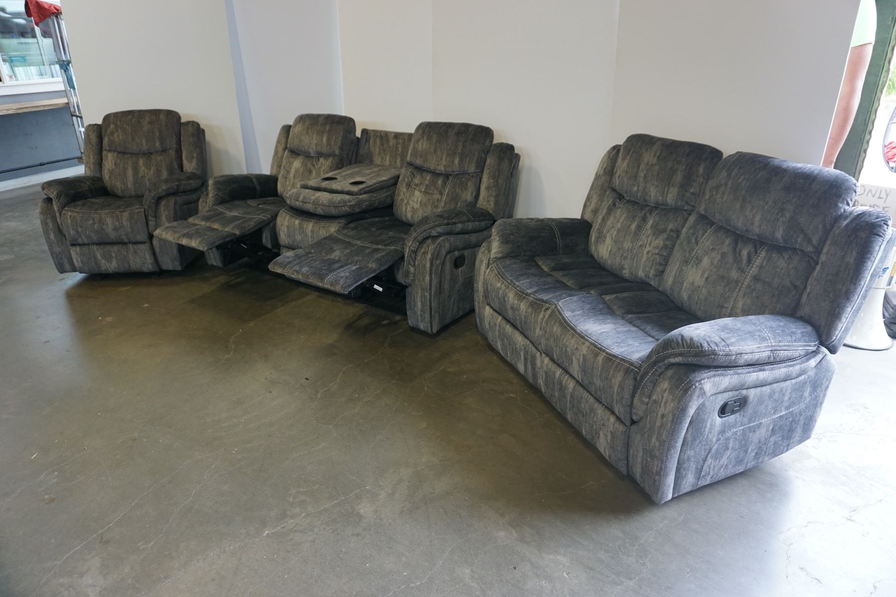 BRAND NEW MODERN VELVET 3 PIECE SOFA SET W/ DROP DOWN CONSOLE AND ROCKING RECLINER - RETAIL $2899