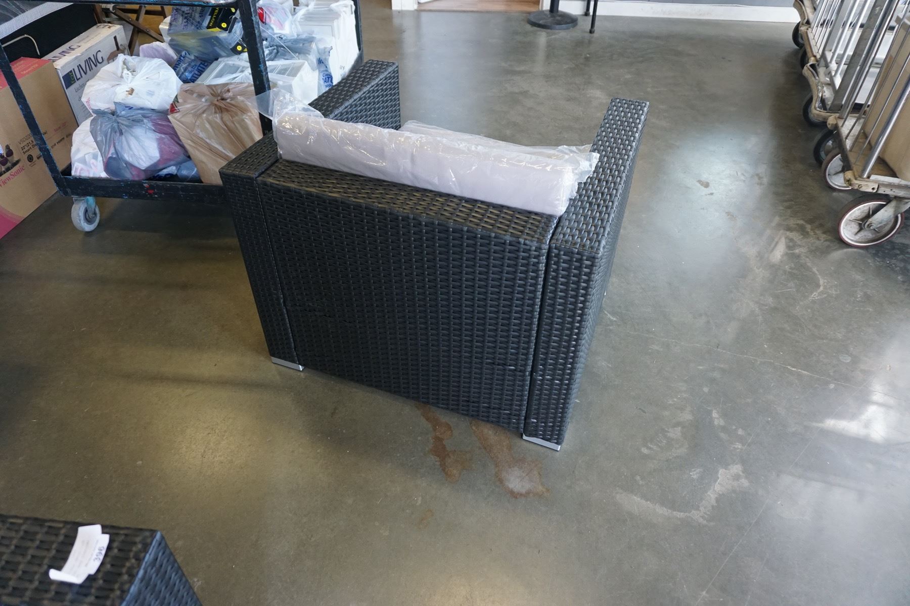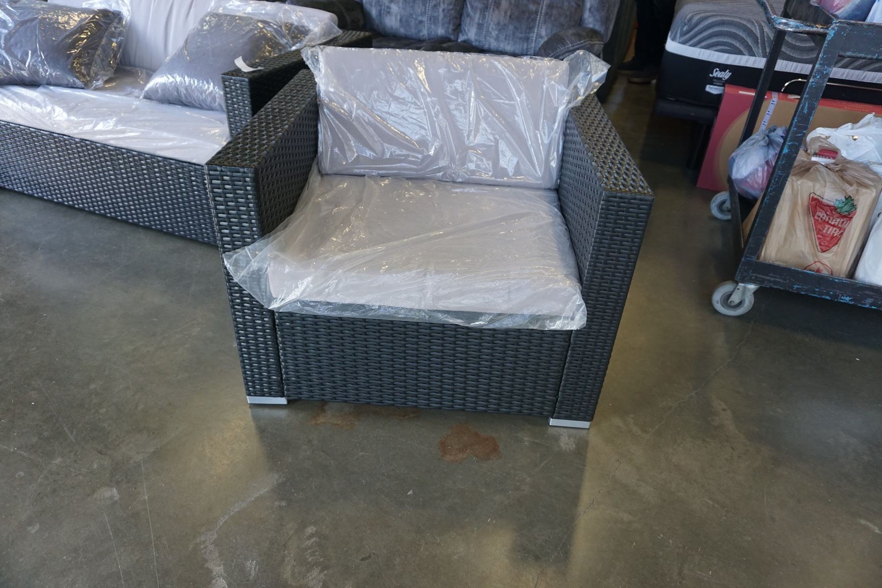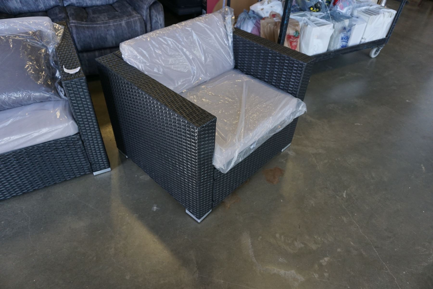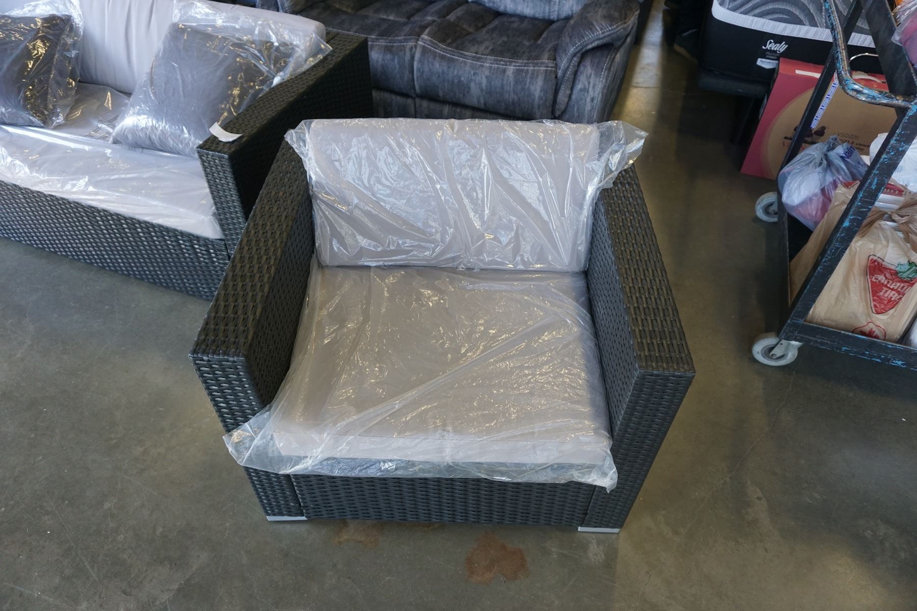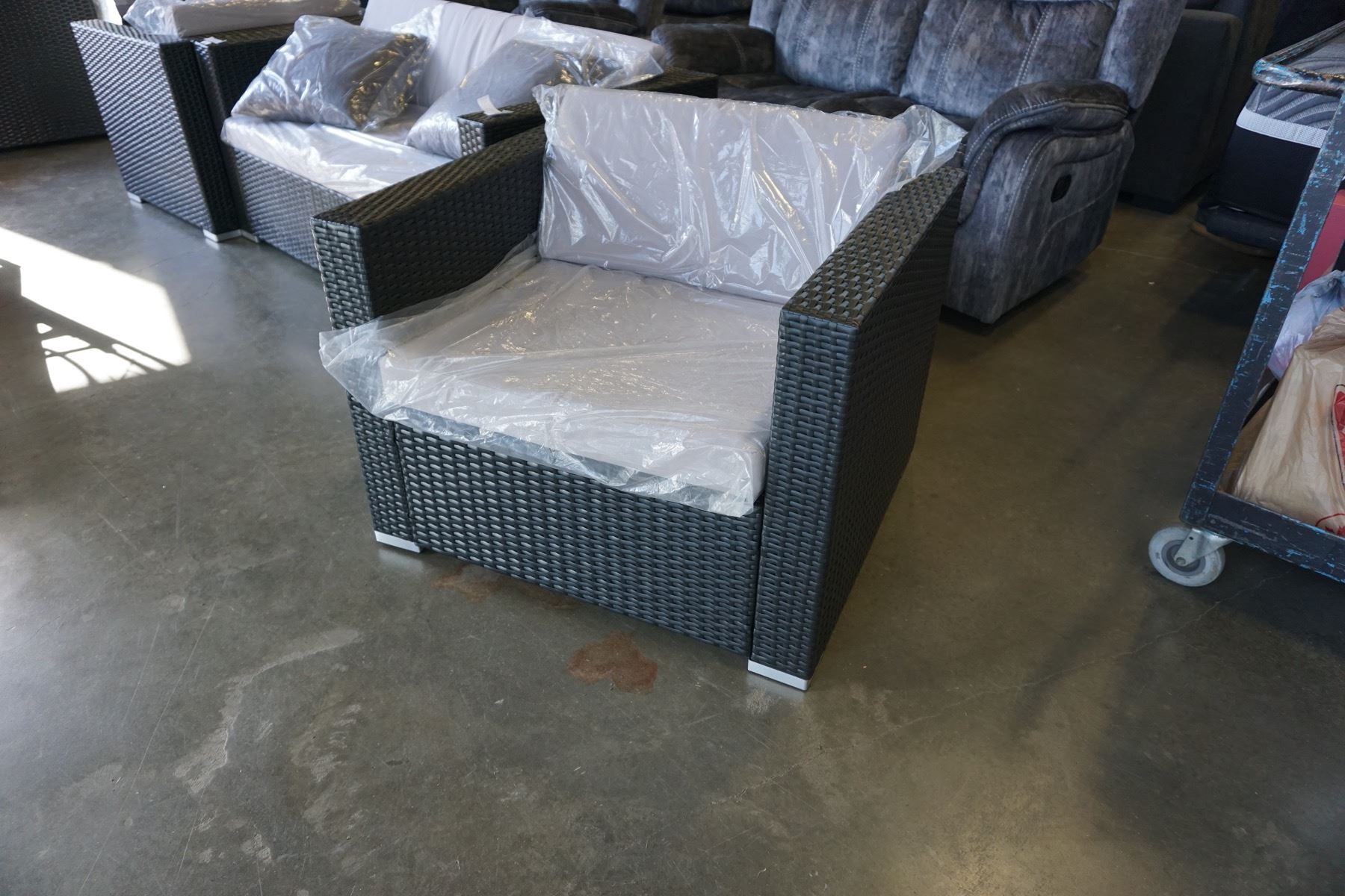 BRAND NEW OUTDOOR RATTAN CLUB CHAIR RETAIL $399 W/ LIGHT GREY CUSHIONS - POWDER COATED STEEL FRAME,