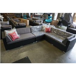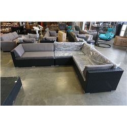 BRAND NEW PREMIUM OUTDOOR GIANT L SECTIONAL AND COFFEE TABLE- RETAIL $2699 W/ LIGHT GREY CUSHIONS AND 4 ACCENT PILLOWS, POWDER COATED ALUMINUM FRAME, WATER/UV RESISTANT WICKER , DENSE FOAM SEATS W/ REMOVEABLE/WASHABLE COVERS