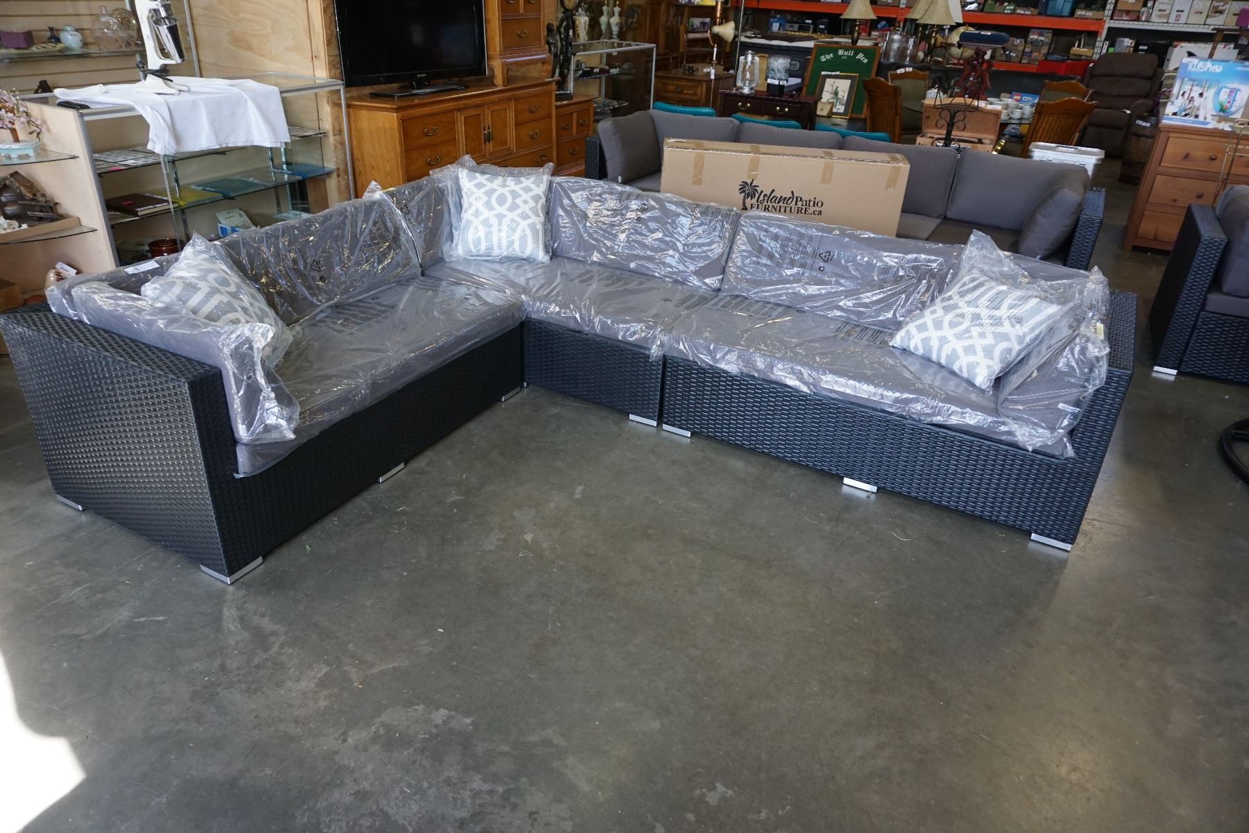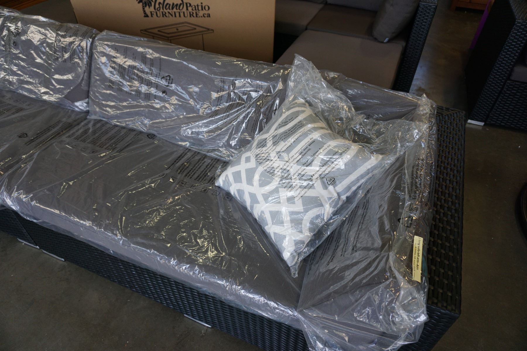 BRAND NEW PREMIUM OUTDOOR GIANT L SECTIONAL W/ DARK GREY CUSHIONS AND 3 ACCENT PILLOWS - RETAIL $219