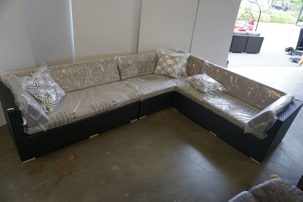 BRAND NEW PREMIUM OUTDOOR GIANT L SECTIONAL W/ LIGHT GREY CUSHIONS AND 3 ACCENT PILLOWS - RETAIL $2199 POWDER COATED ALUMINUM FRAME, DENSE FOAM SEATS, WATER/UV RESISTANT WICKER