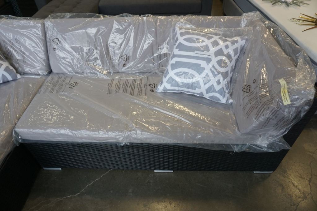 BRAND NEW PREMIUM SMALL L OUTDOOR SECTIONAL RETAIL $1199 W/ LIGHT GREY CUSHIONS AND 2 ACCENT PILLOWS - MADE W/ POWDER COATED ALUMINUM FRAME, UV AND WATER RESISITANT WICKER, AND REMOVEABLE AND WASHABLE CUSHIONS 89" X 57"