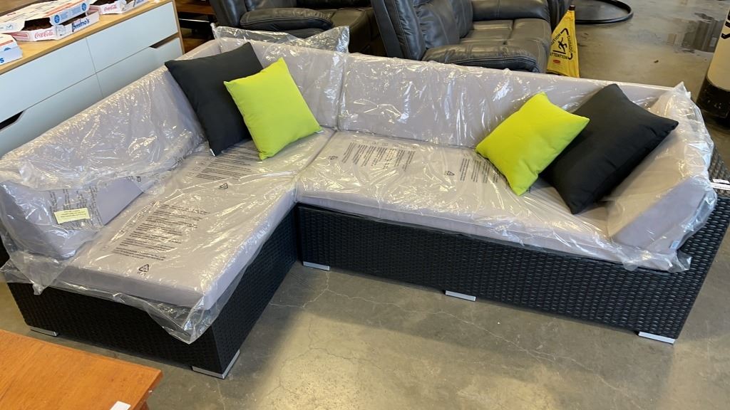 BRAND NEW PREMIUM SMALL L OUTDOOR SECTIONAL RETAIL $1199 W/ LIGHT GREY CUSHIONS AND 2 ACCENT PILLOWS