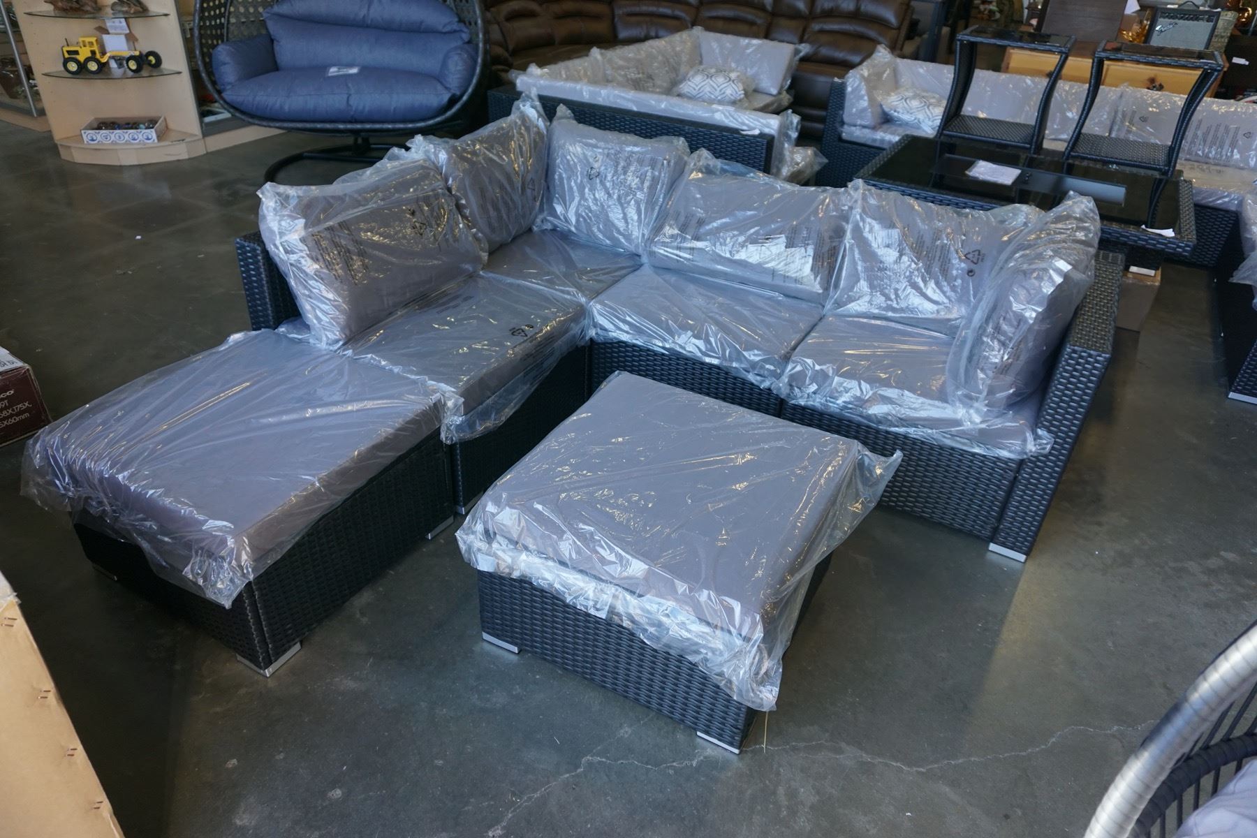 BRAND NEW RATTAN OUTDOOR 6 PIECE MODULAR SECTIONAL SOFA W/ DARK GREY CUSHIONS - RETAIL $1499 POWDER COATED STEEL FRAME AND REMOVABLE WASHABLE CUSHIONS