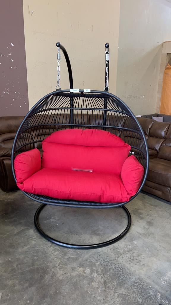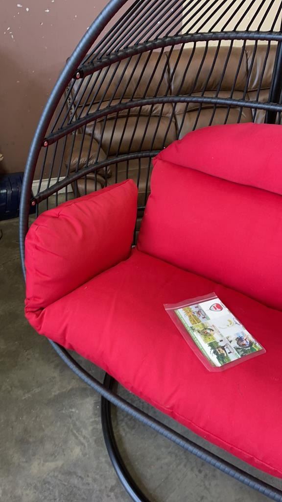 BRAND NEW RED DOUBLE HANGING EGG CHAIR - RETAIL $1969 W/ FOLDABLE FRAME, POWDER COATED STEEL FRAME, RATED FOR 600LBS