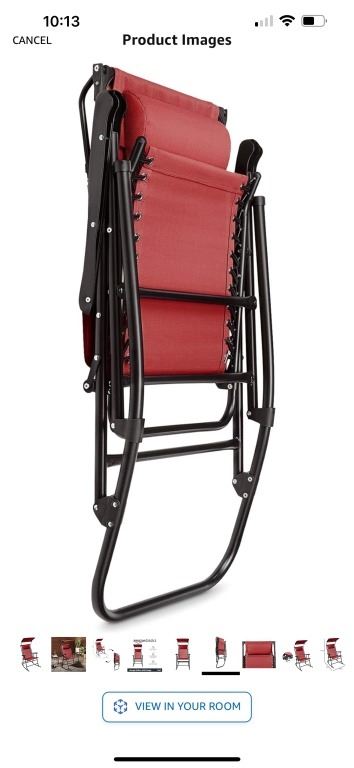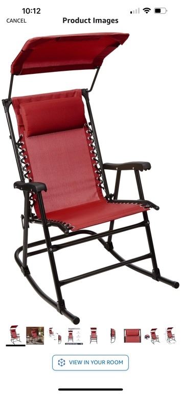 BRAND NEW RED FOLDABLE ROCKING CHAIR WITH CANOPY, WITH NECK PILLOW AND FOLD AWAY SUN SHADE, RETAIL $235