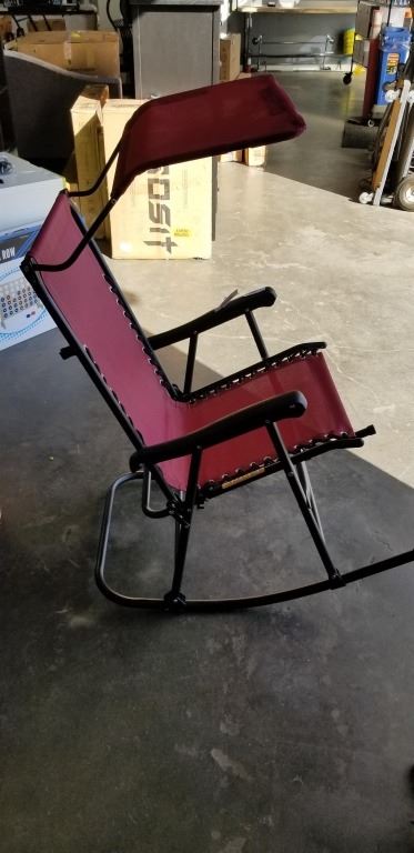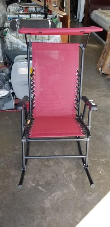 BRAND NEW RED FOLDABLE ROCKING CHAIR WITH CANOPY, WITH NECK PILLOW AND FOLD AWAY SUN SHADE, RETAIL $235