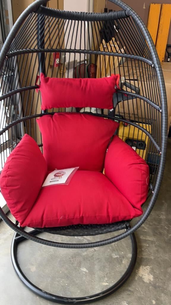 BRAND NEW RED SINGLE HANGING EGG CHAIR - RETAIL $949 W/ NECK PILLOW, FOLDABLE FRAME, POWDER COATED S