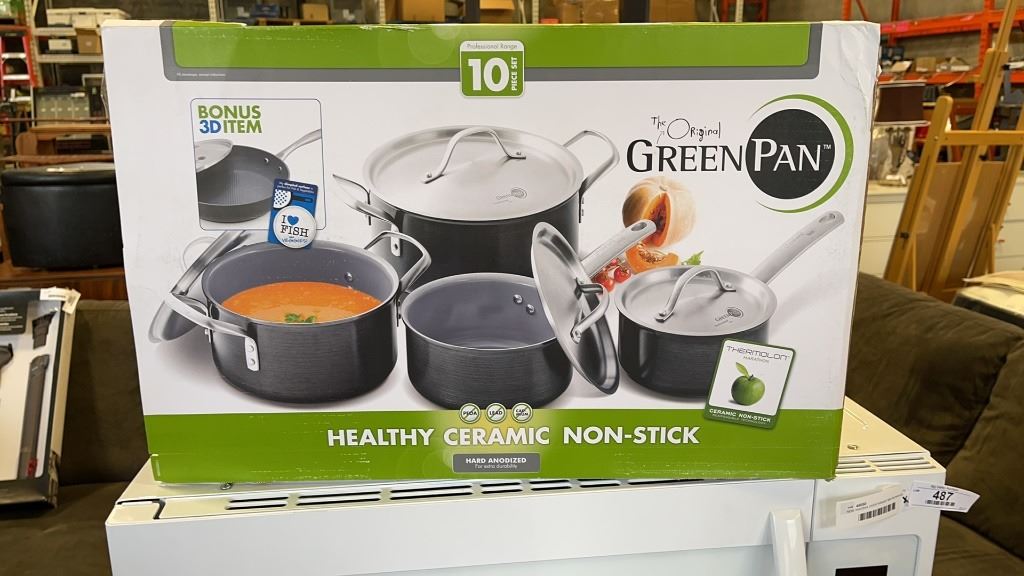 BRAND NEW THE ORIGINAL GREEN PAN SET OF 11 CERAMIC NON STICK COOKWARE - INCLUDES FRYPAN, 3 COVERED SAUCEPANS, COVERED SKILLET AND COVERED CASSEROLE RETAIL $499