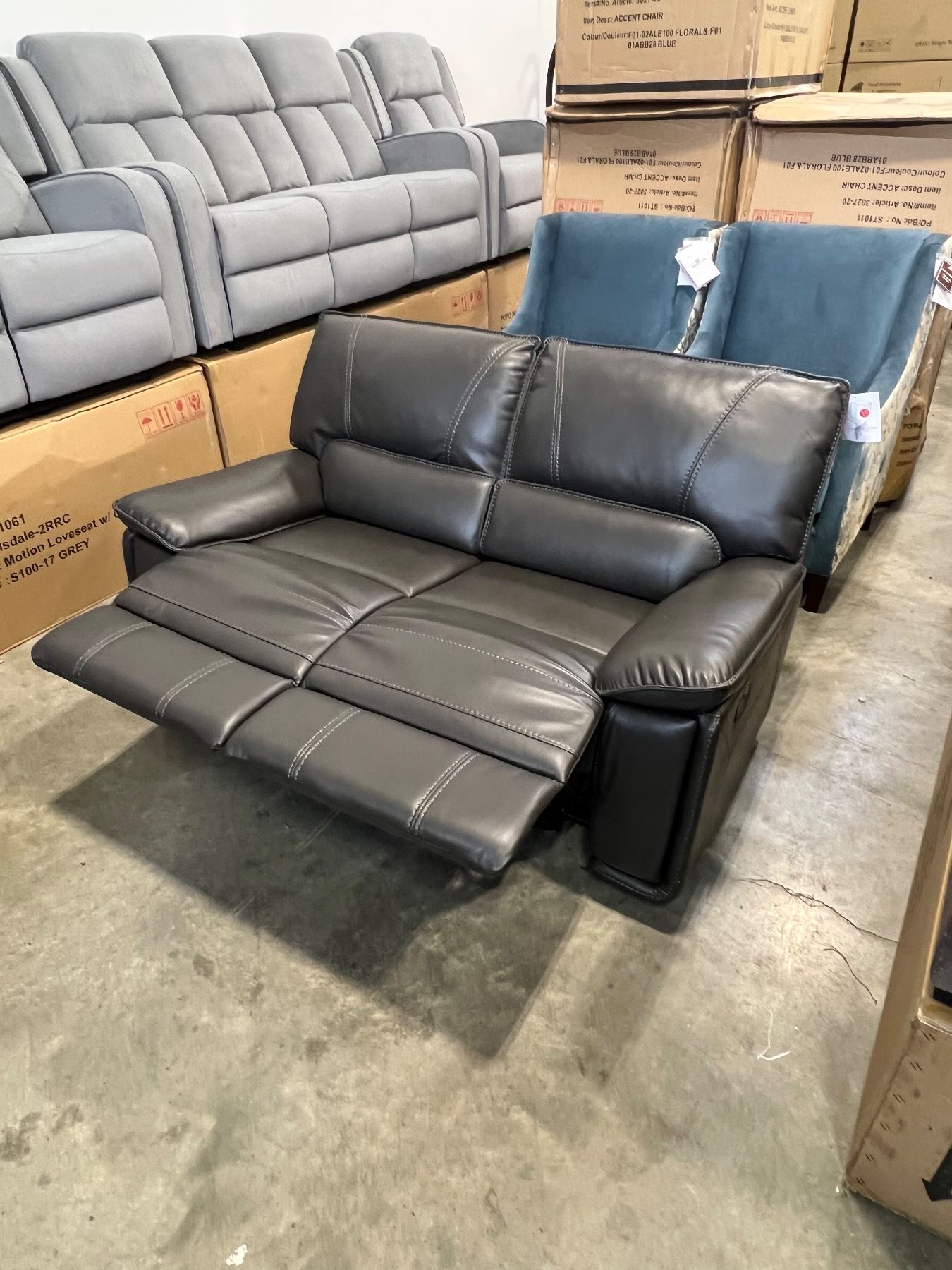 BRAND NEW WHITNEY GREY LEATHER RECLINE LOVE SEAT - RETAIL $1699, HIGH QUALITY STITCHING, GEL MEMOR F