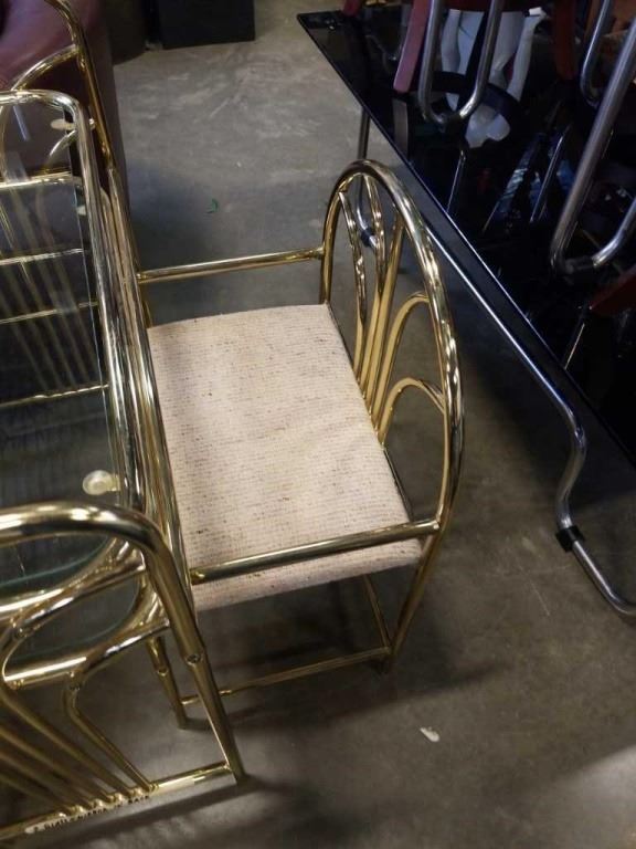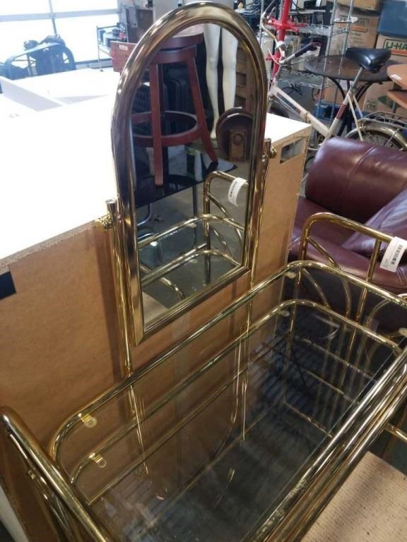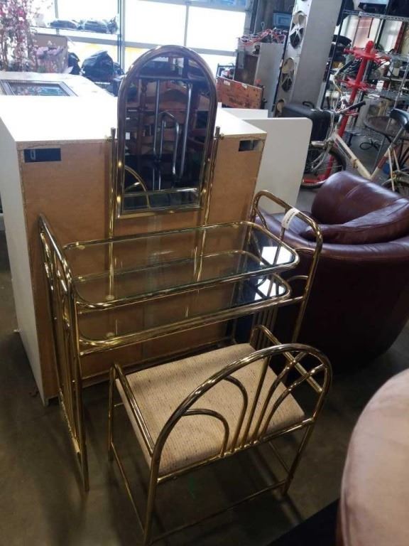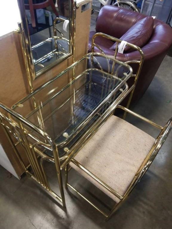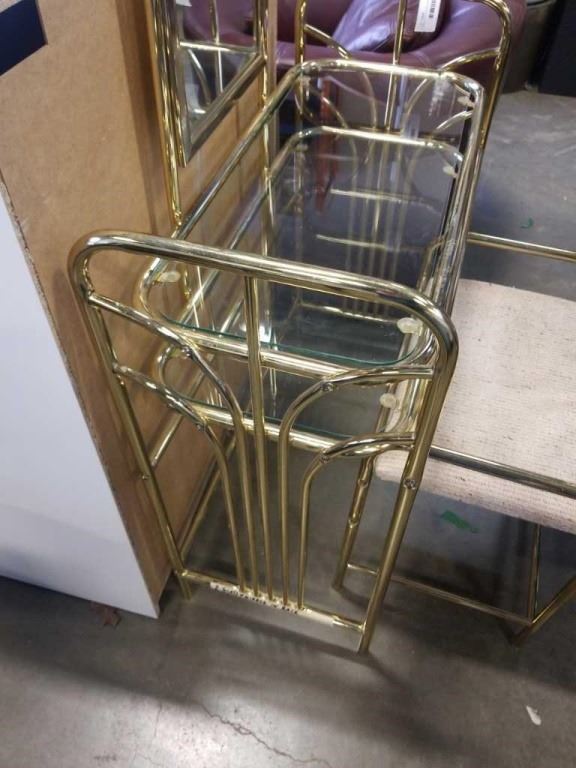 BRASS AND GLASS VANITY WITH MIRROR AND STOOL