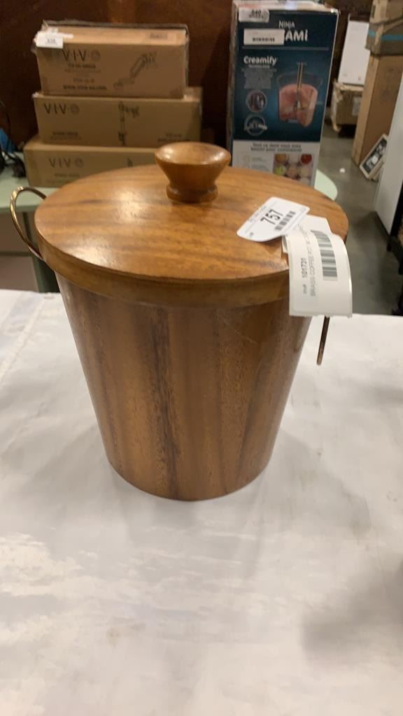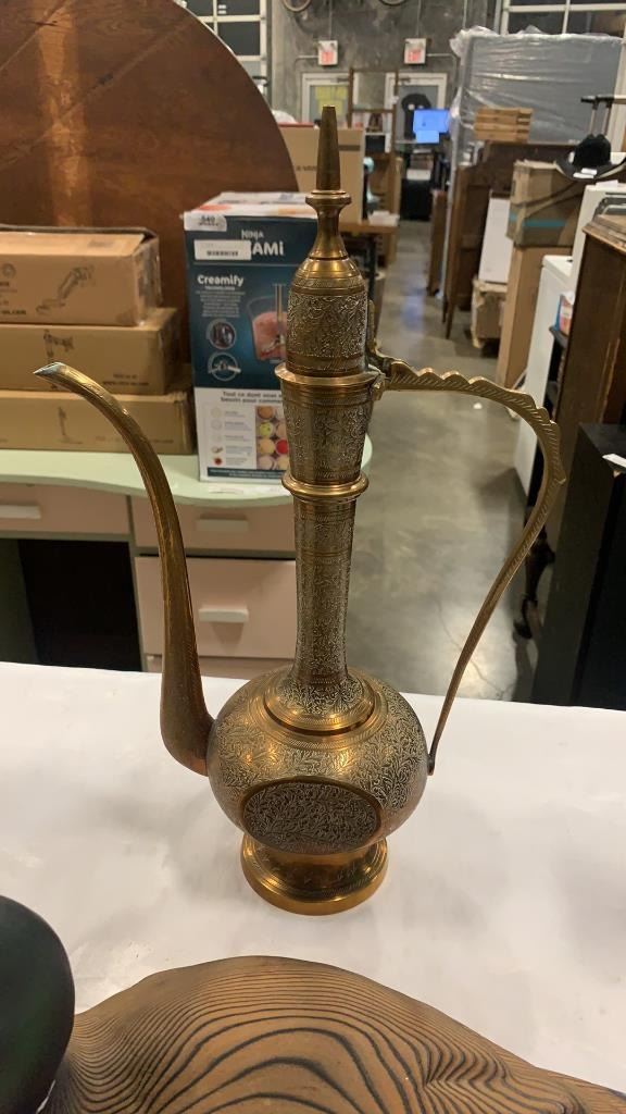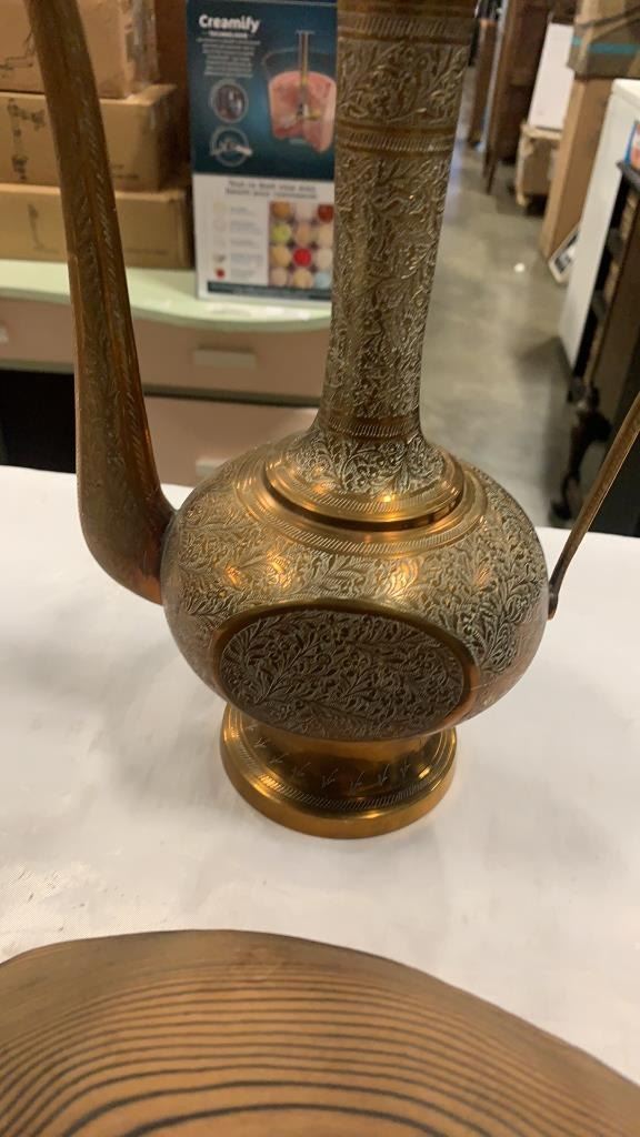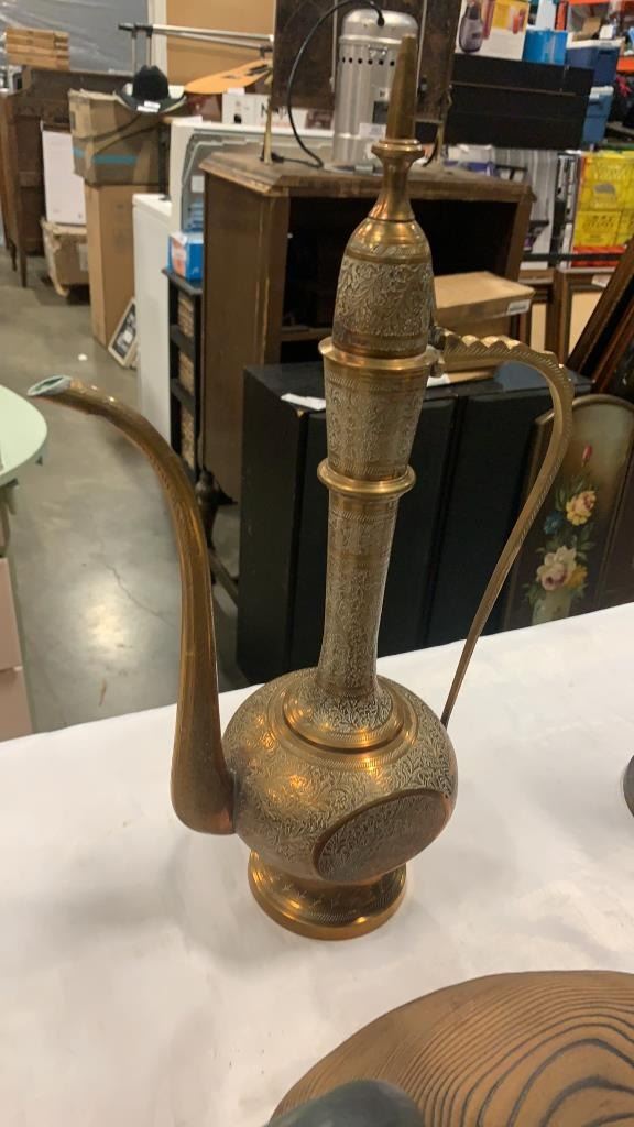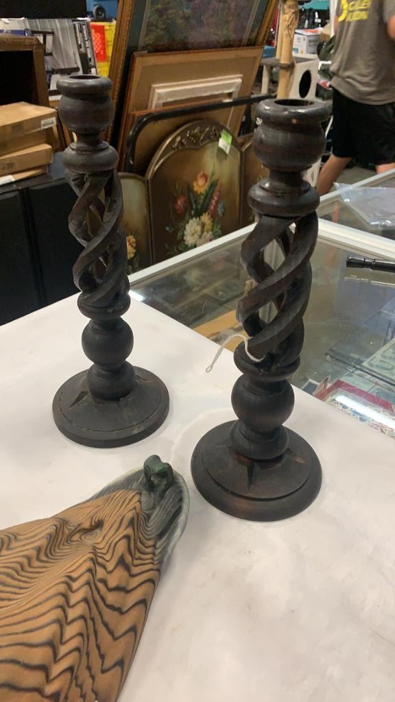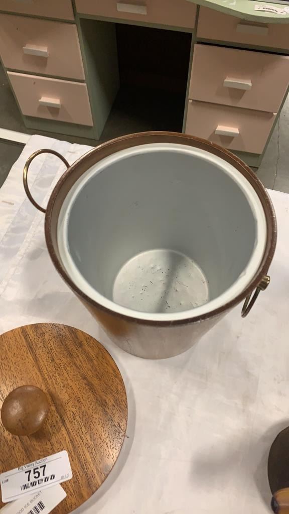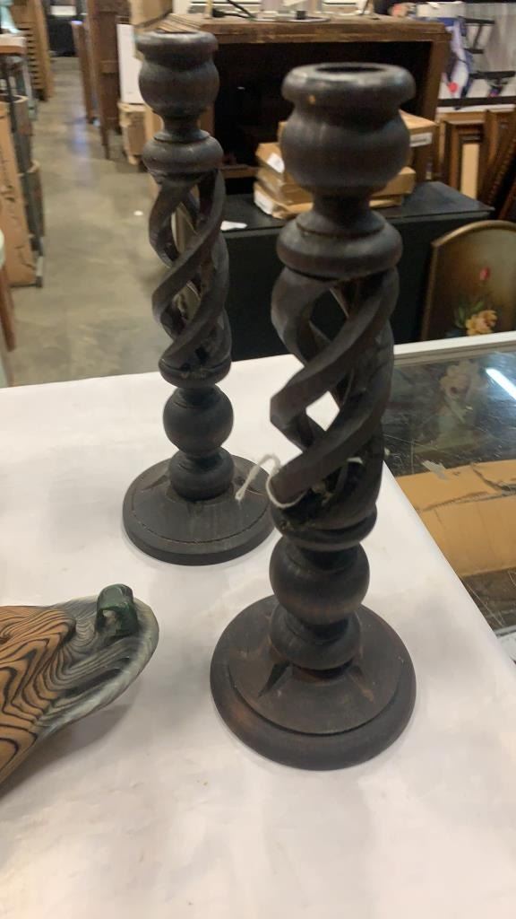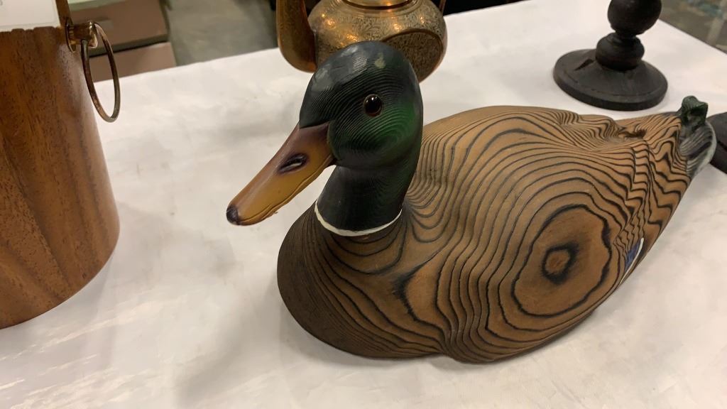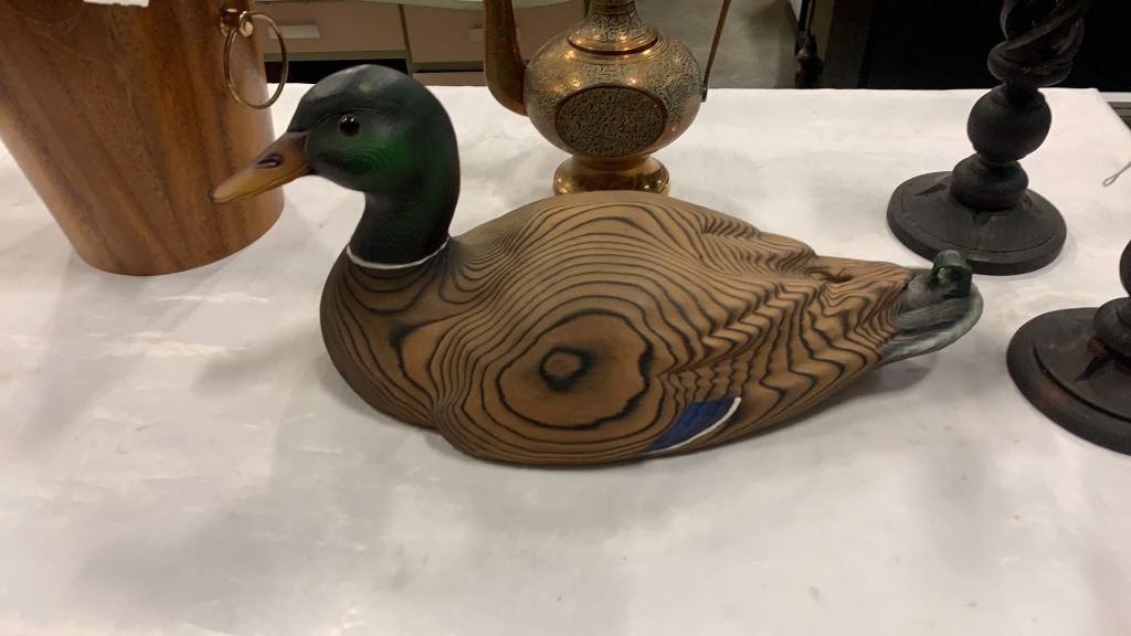 BRASS COFFEE POT, WOOD ICE BUCKET, WOOD DUCK, 2 WOOD CANDLE STICKS