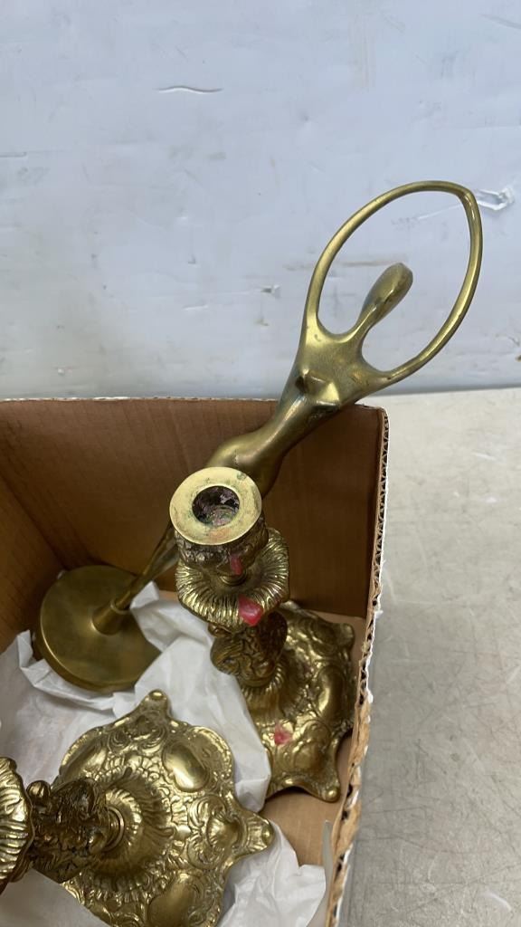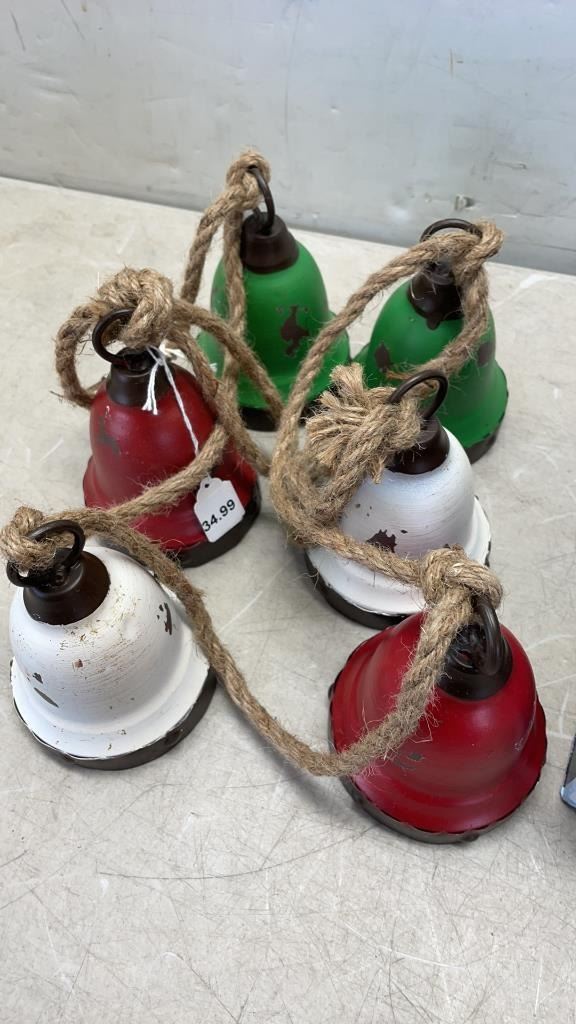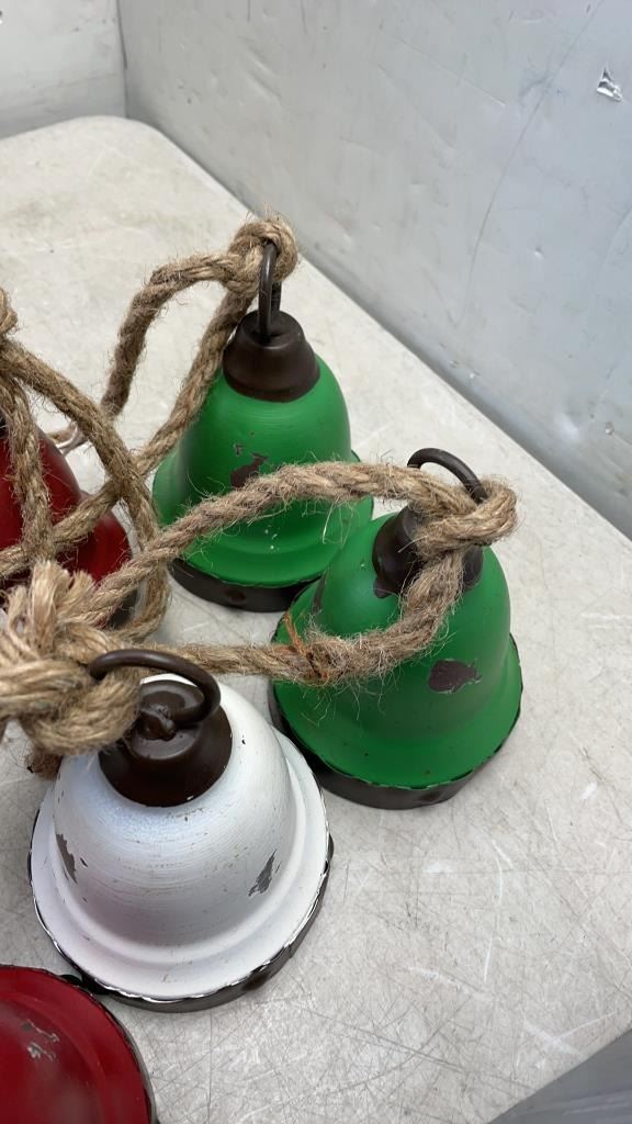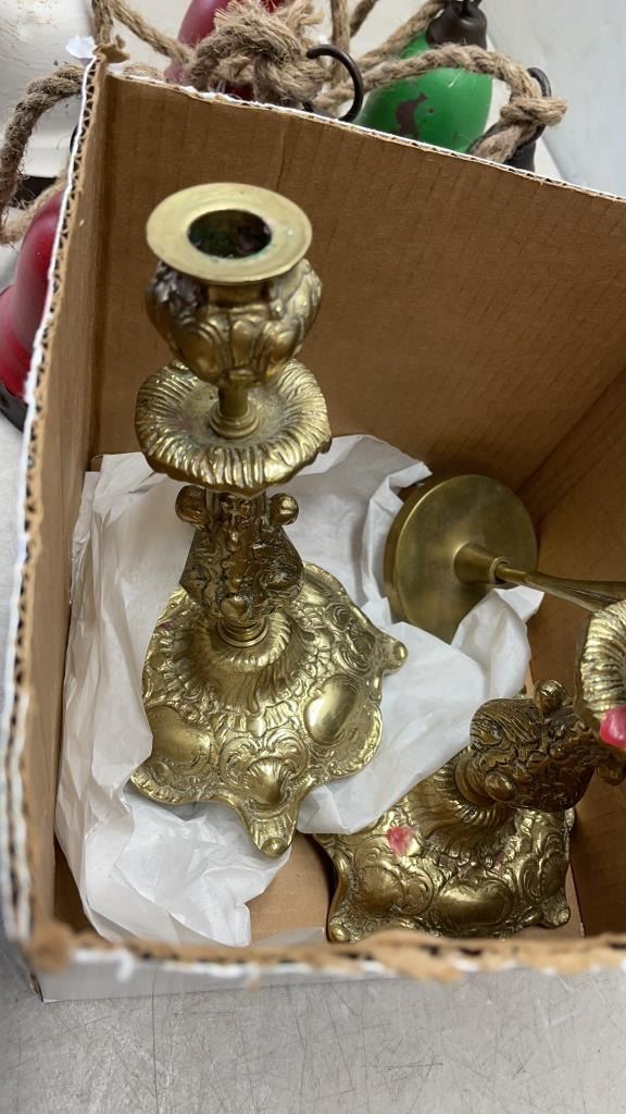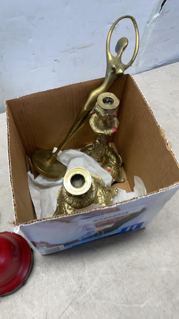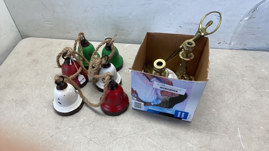 BRASS FIGURE WITH CANDLE STANDS AND 6 METAL BELLS