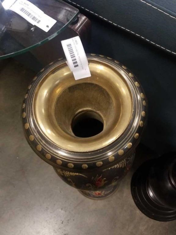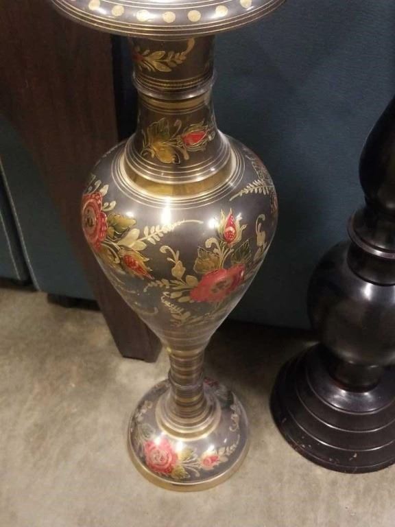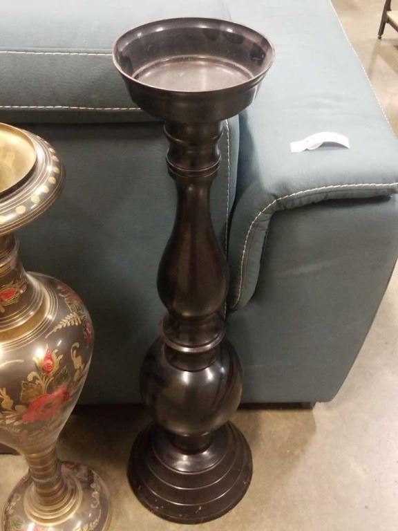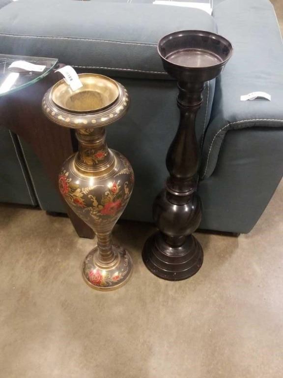 BRASS VASE AND METAL PEDESTAL DISH - 30 INCHES TALL AND 33 INCHES TALL